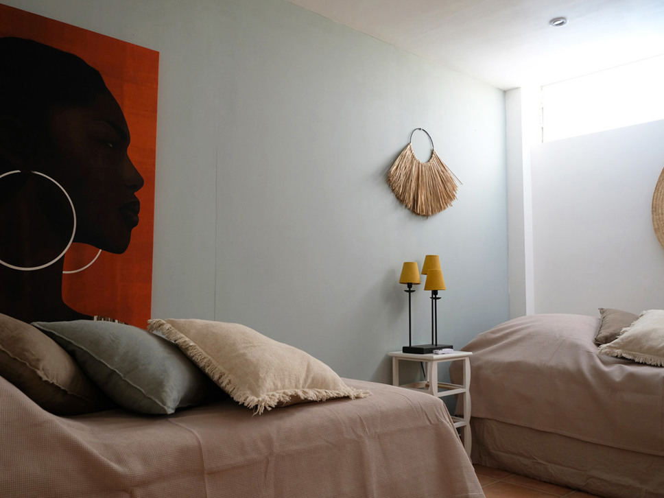 Op de benedenverdieping, niveau zwembad; 2 slaapkamers en 1 badkamer. Dit is een separaat appartement enkel via buiten te bereiken. Slaapkamer 4 biedt een tweepersoonsbed 160x200. Slaapkamer 5 is een kinderkamer met twee eenpersoonsbedden 90x200. Beide slaapkamers zijn voorzien van een mobiele airconditioning unit. De eenvoudige badkamer biedt een douche, wastafel en een W.C. Het appartement biedt ook een zithoek en een eenvoudige kitchenette.