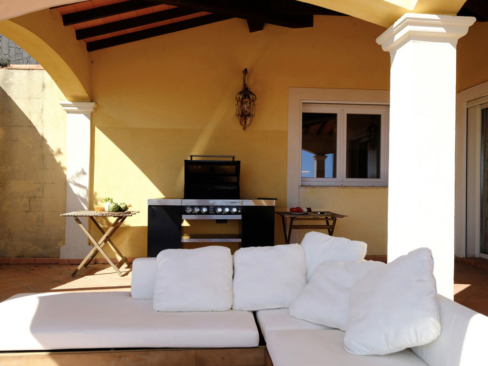 Vanuit de living zijn er openslaande deuren naar het grote zonnige terras. Dit terras strekt zich uit over de gehele lengte van de villa en is ook bereikbaar vanuit de keuken. Het terras is deels overdekt.