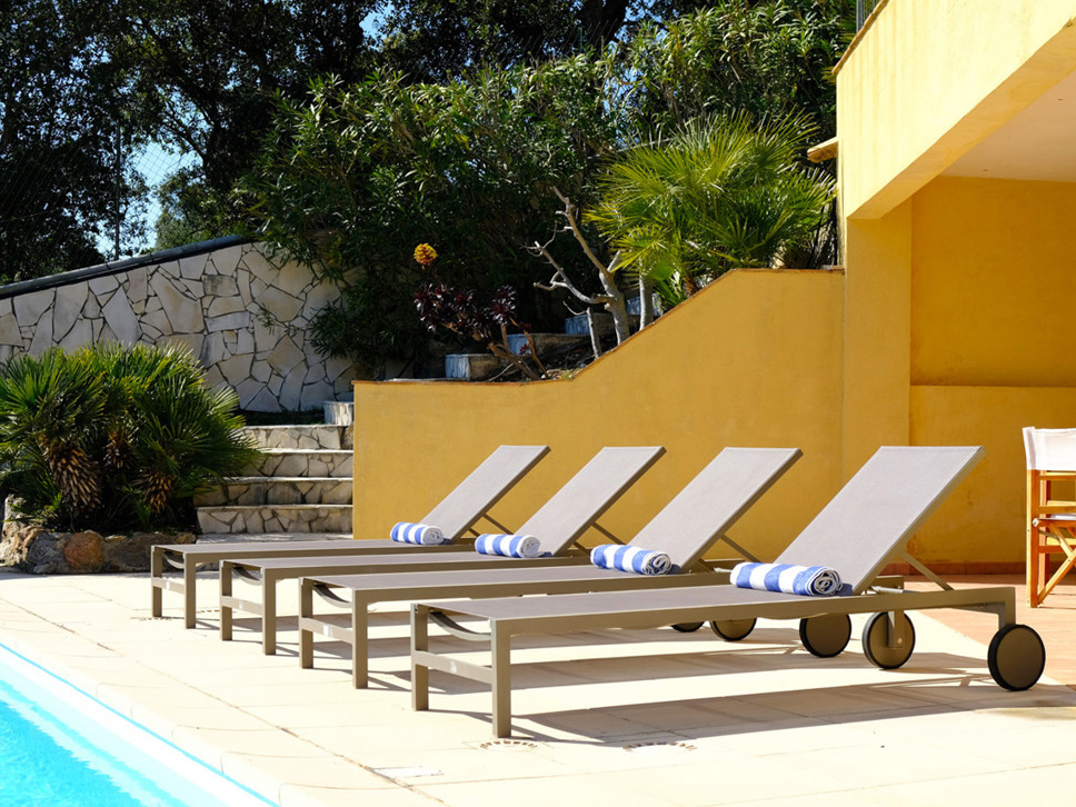 Het zwembad is van het type infinity. Ook hier vindt u een loungeset, 6 sunloungers en een eettafel met stoelen onder het deels overdekte terras. De villa biedt dan ook een ruime keuze aan zitplaatsen zowel binnen als buiten. Er is ook een buitendouche.