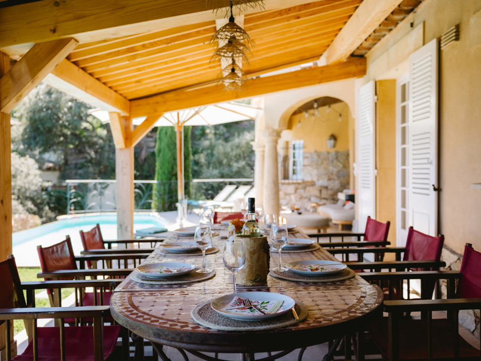 Aan de voorzijde van de villa ligt het zwembad tussen de tuin en overdekt terras. Het hoofdterras is overdekt en voorzien van ruime eettafel. Hier kunt u heerlijk buiten eten en genieten van het brede zeezicht. Ook de loungeset staat in de schaduw en wel onder de met jasmijn begroeide pergola naast het zwembad. Slaapkamers 2 en 3 bieden toegang tot dit terras.
