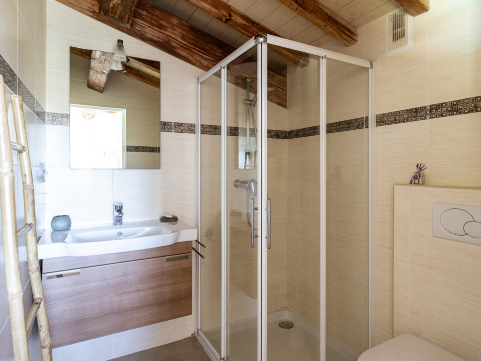 Slaapkamer 4 heeft een eigen badkamer in de gang (douche, wastafel). In deze gang bevindt zich ook de was/droogmachine. Er is een apart (gasten) toilet in de woning.