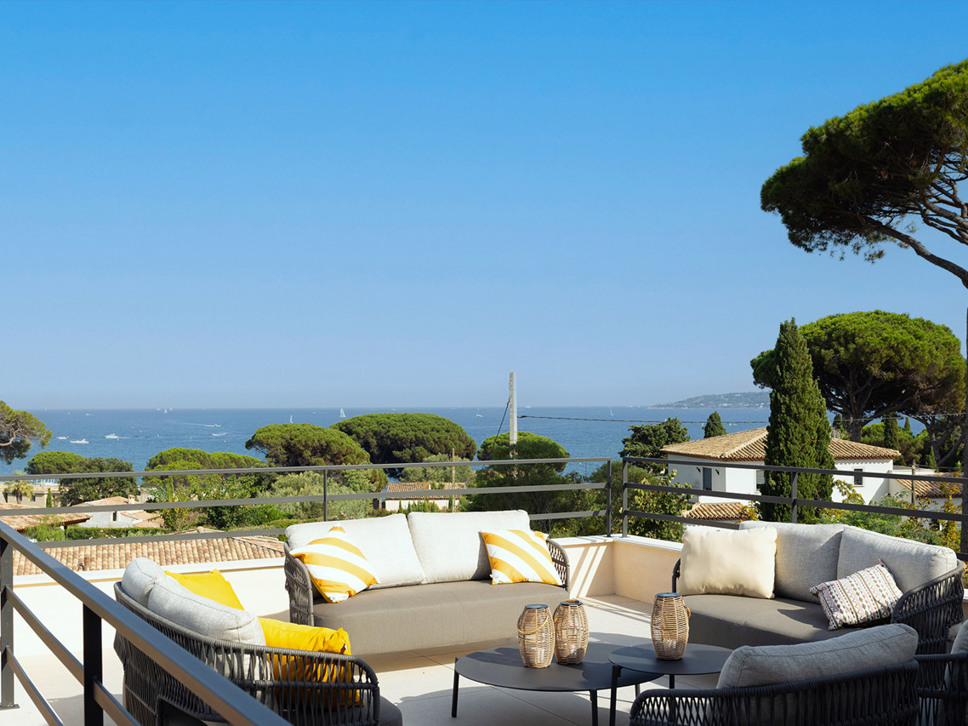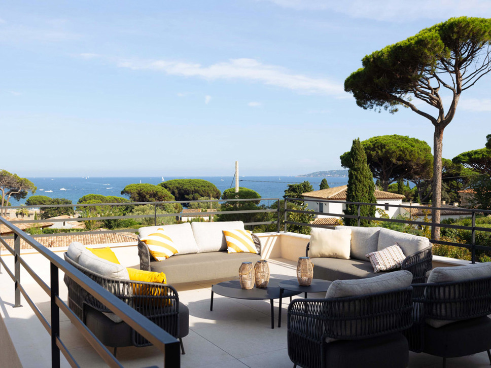 Op het dakterras op de 1e verdieping staat een luxe loungeset. Vanuit hier is het zeezicht nog mooier. Wat ons betreft is dit dan ook een ideale positie en plaats om de avond van start te gaan met een glas rose in de hand genietend van het prachtige uitzicht.