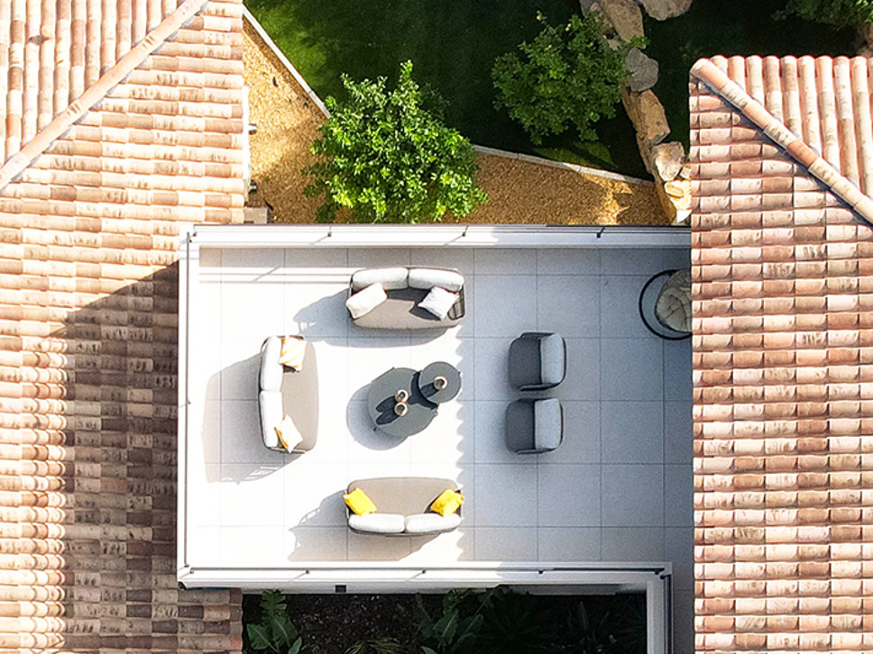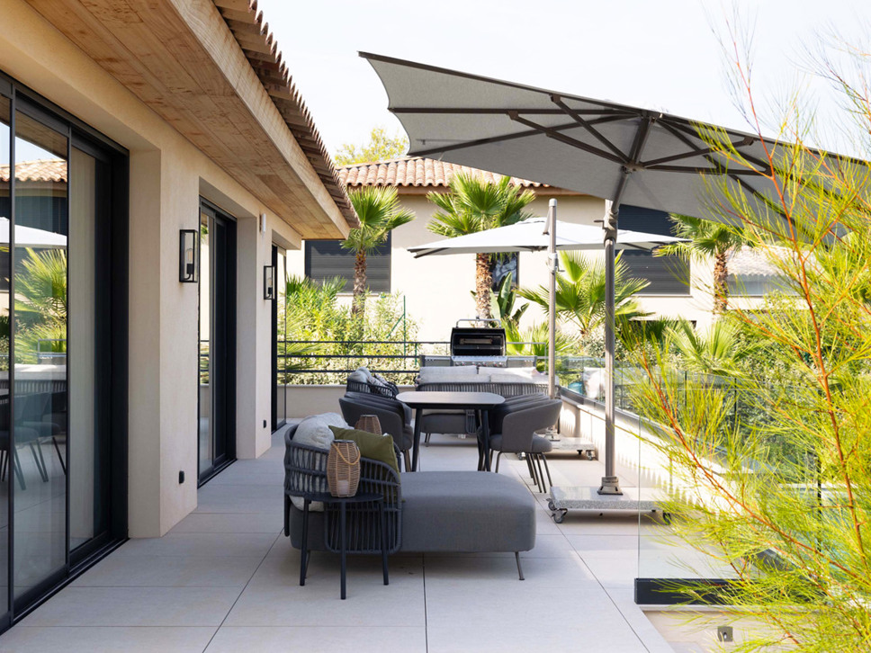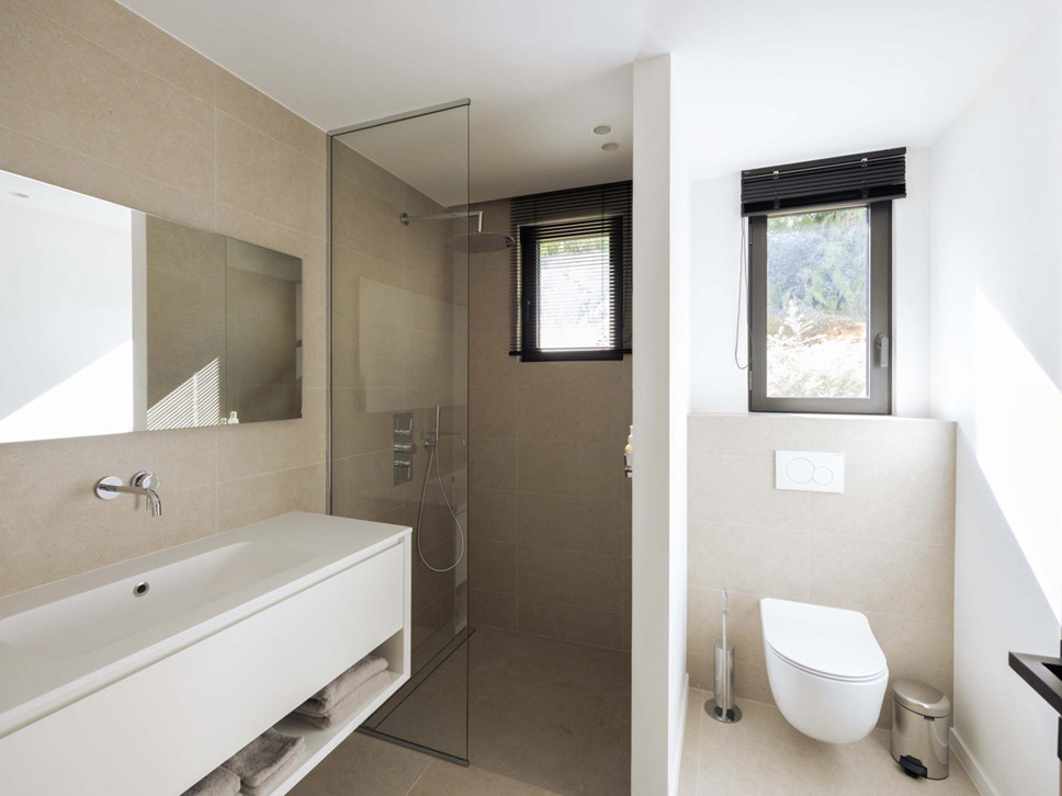 Zowel vanuit de living als vanuit de keuken bieden grote schuifdeuren toegang tot het royale terras. Op het terras staan diverse luxe zitmeubelen waaronder een loungeset, een eettafel en een grote BBQ. U beschikt dan ook over voldoende ruimte om met het gezelschap samen te kunnen ontbijten of gezellig te dineren met breed zicht op de Middellandse Zee. Twee grote parasols zorgen voor verkoelende schaduw.