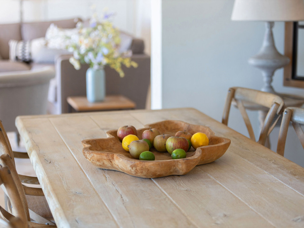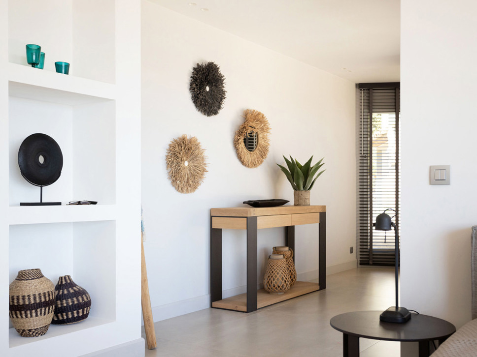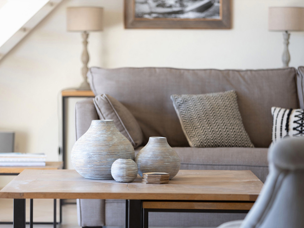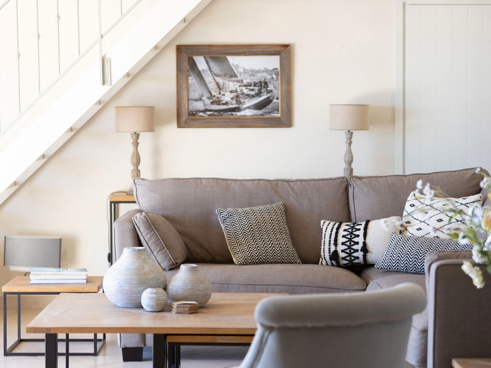 De living is sfeervol en comfy ingericht met veel aandacht voor kleur en comfort. Doordat de terras schuifdeuren in de wand verdwijnen is binnen direct verbonden met buiten, het terras. Het oog wordt direct getrokken door het panoramische zicht op zee.