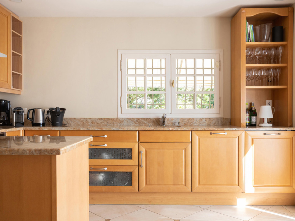 De villa is een zogenaamde split level. De begane grond biedt living, eetkamer en royale keuken. Enkele treden hoger bevinden zich 3 van de 4 slaapkamers. Er is een TV-ruimte op de mezzanine. Op de 1e verdieping bevindt zich slaapkamer 4.