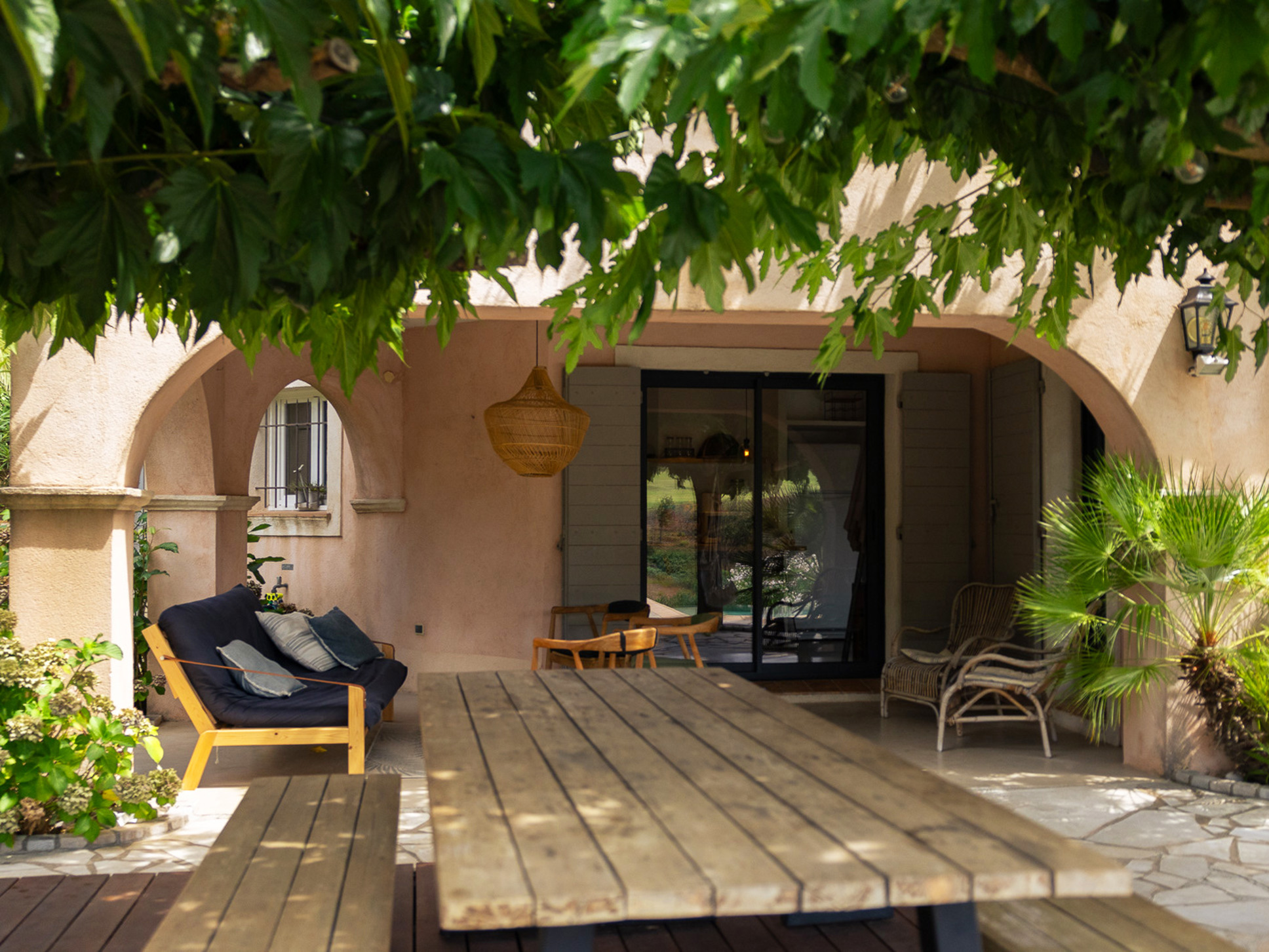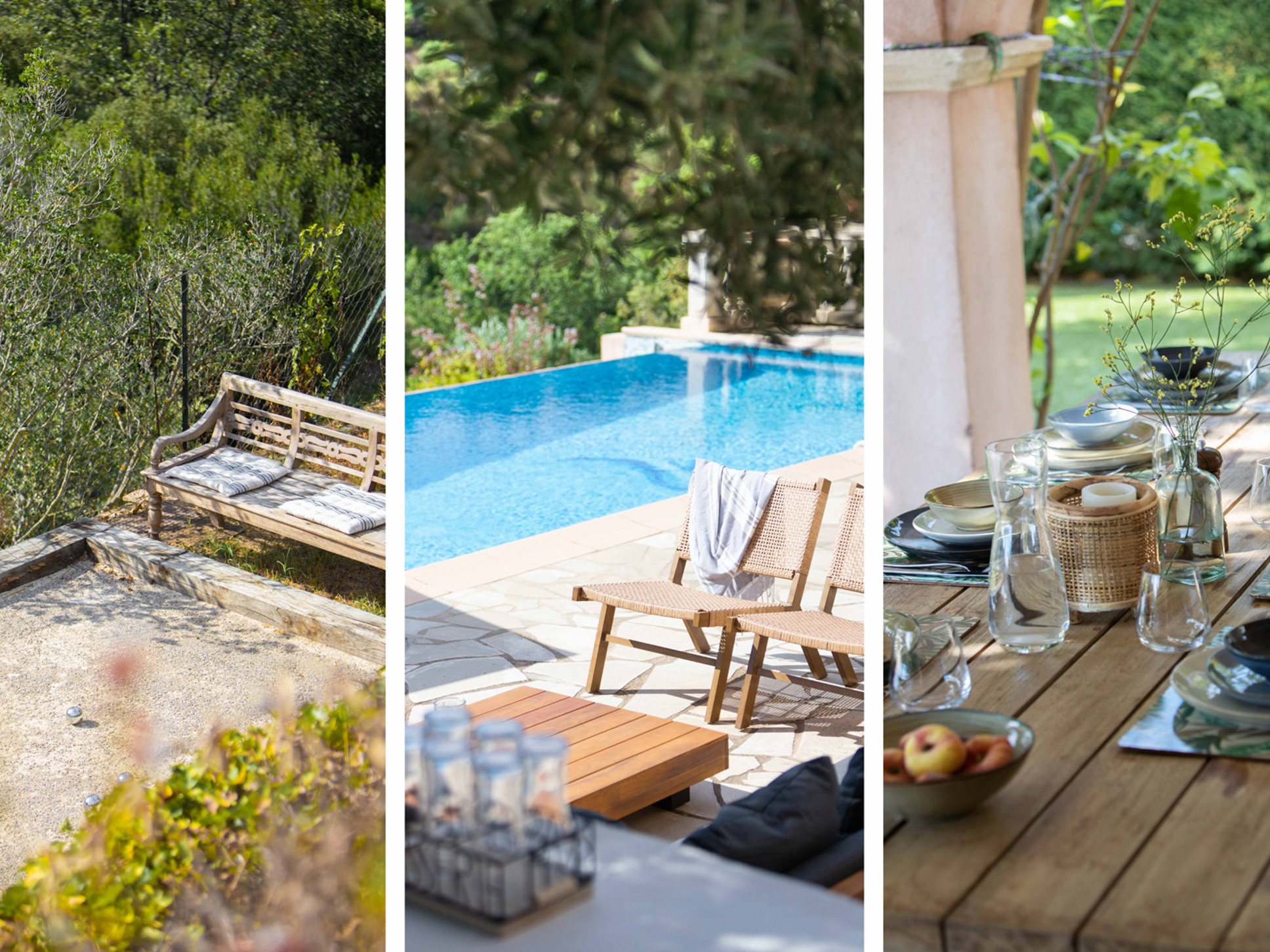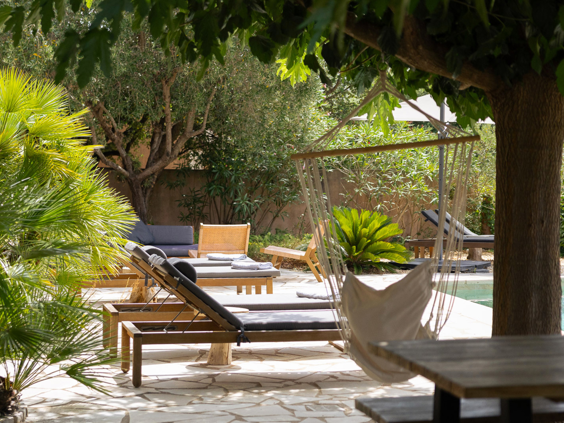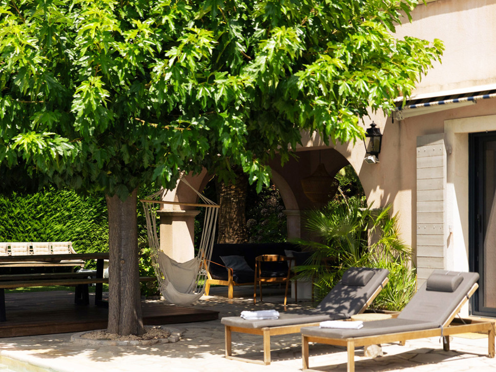 Het ruime, zuid georiënteerde zonneterras biedt een fraai uitzicht over de vallei en is voorzien van comfortabele ligbedden. Meerdere kleine zithoekjes onder en tussen de palmbomen bieden voor iedereen het perfecte plekje voor een boek of een goed glas wijn. Kinderen vermaken zich met de pingpong-tafel of op het grasveld in de hangstoelen en hangmat onder de lommerrijke dak-platanen. Aan het einde van de dag is de petanque-baan op eigen terrein de perfecte plek voor een apero en een spelletje petanque met de hele familie.