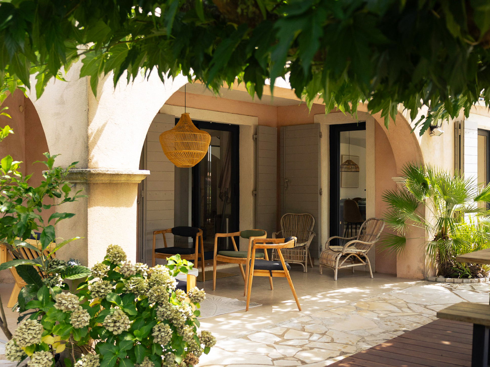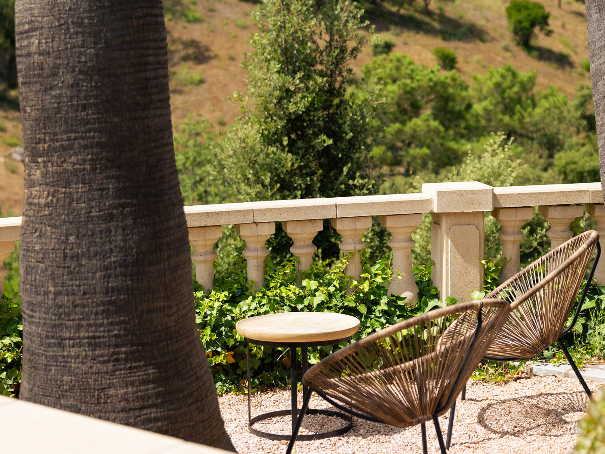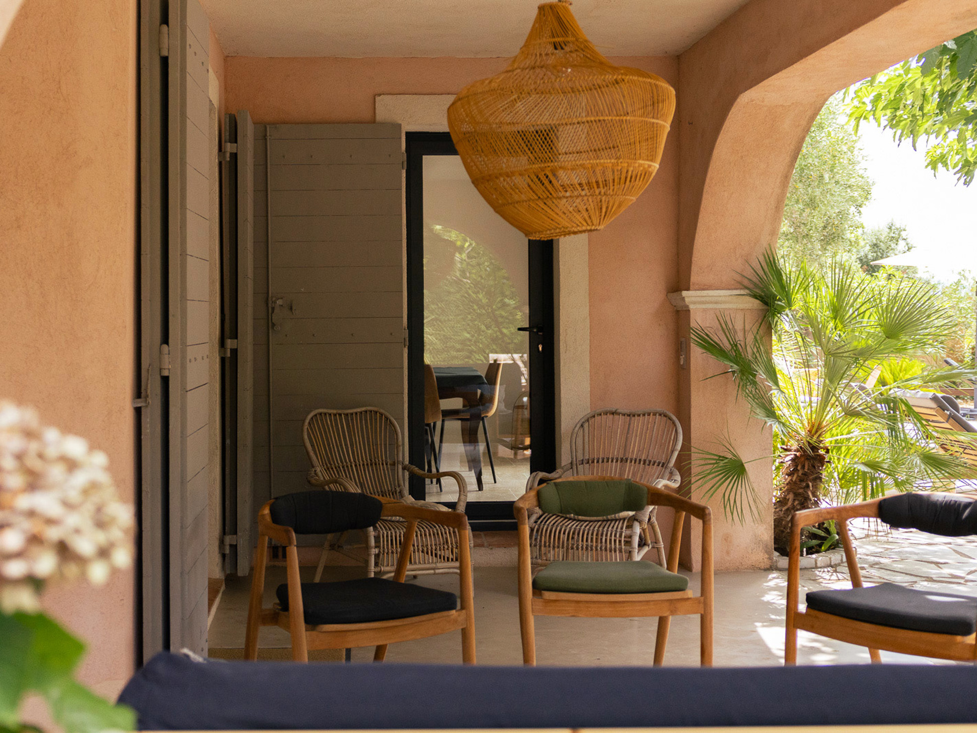Het ruime, zuid georiënteerde zonneterras biedt een fraai uitzicht over de vallei en is voorzien van comfortabele ligbedden. Meerdere kleine zithoekjes onder en tussen de palmbomen bieden voor iedereen het perfecte plekje voor een boek of een goed glas wijn. Kinderen vermaken zich met de pingpong-tafel of op het grasveld in de hangstoelen en hangmat onder de lommerrijke dak-platanen. Aan het einde van de dag is de petanque-baan op eigen terrein de perfecte plek voor een apero en een spelletje petanque met de hele familie.