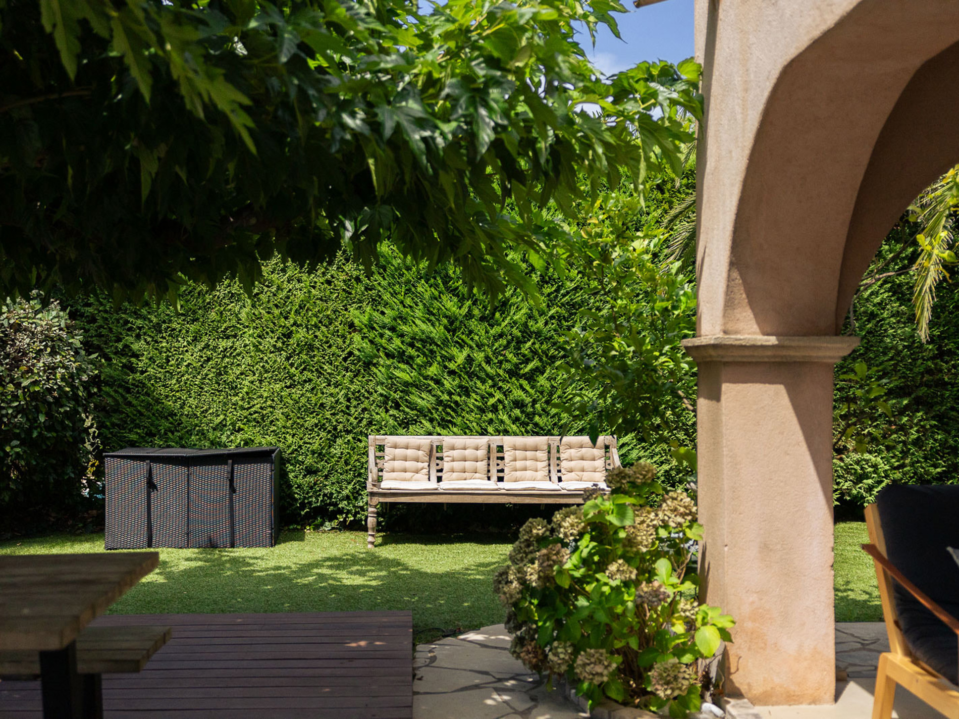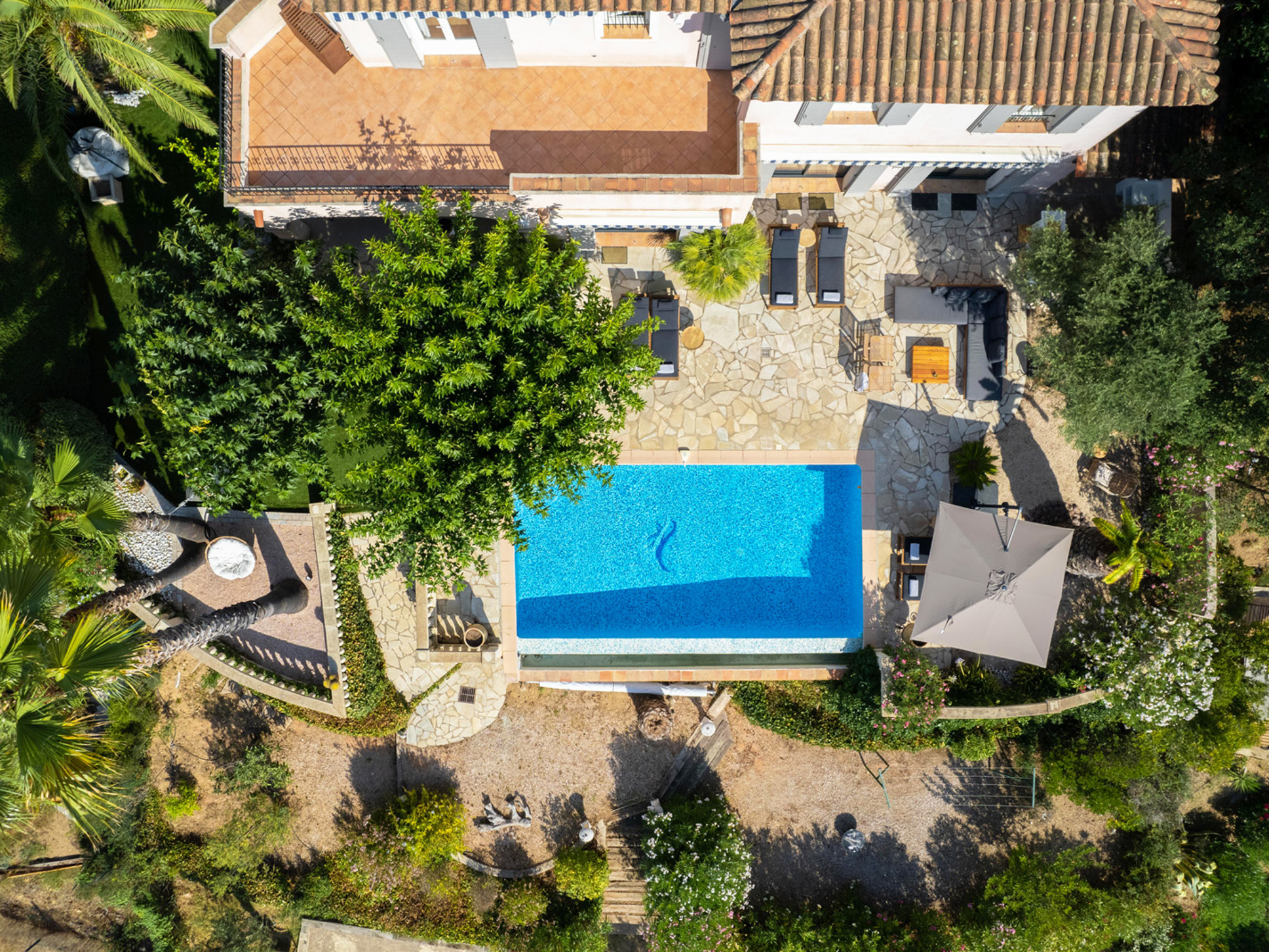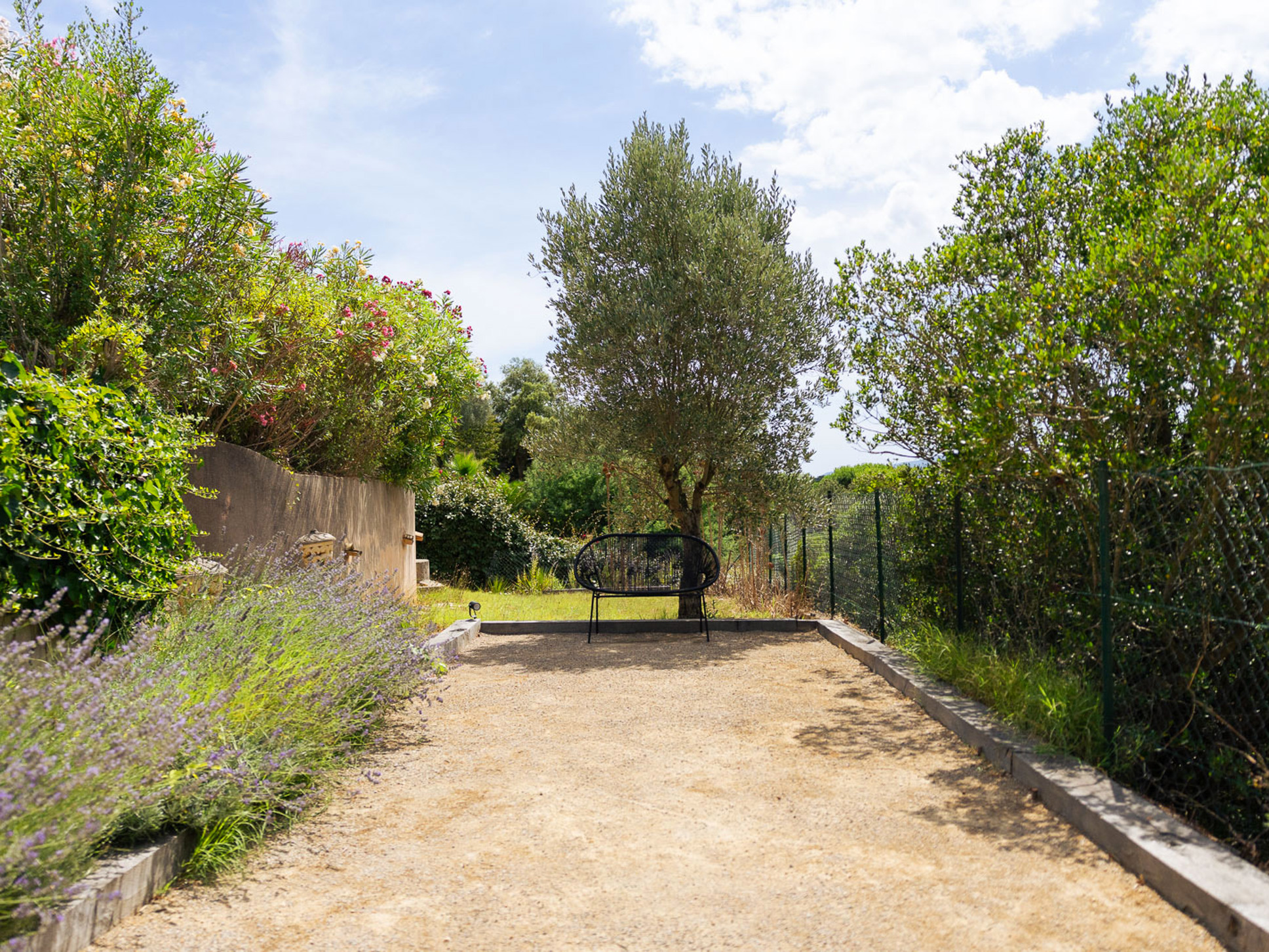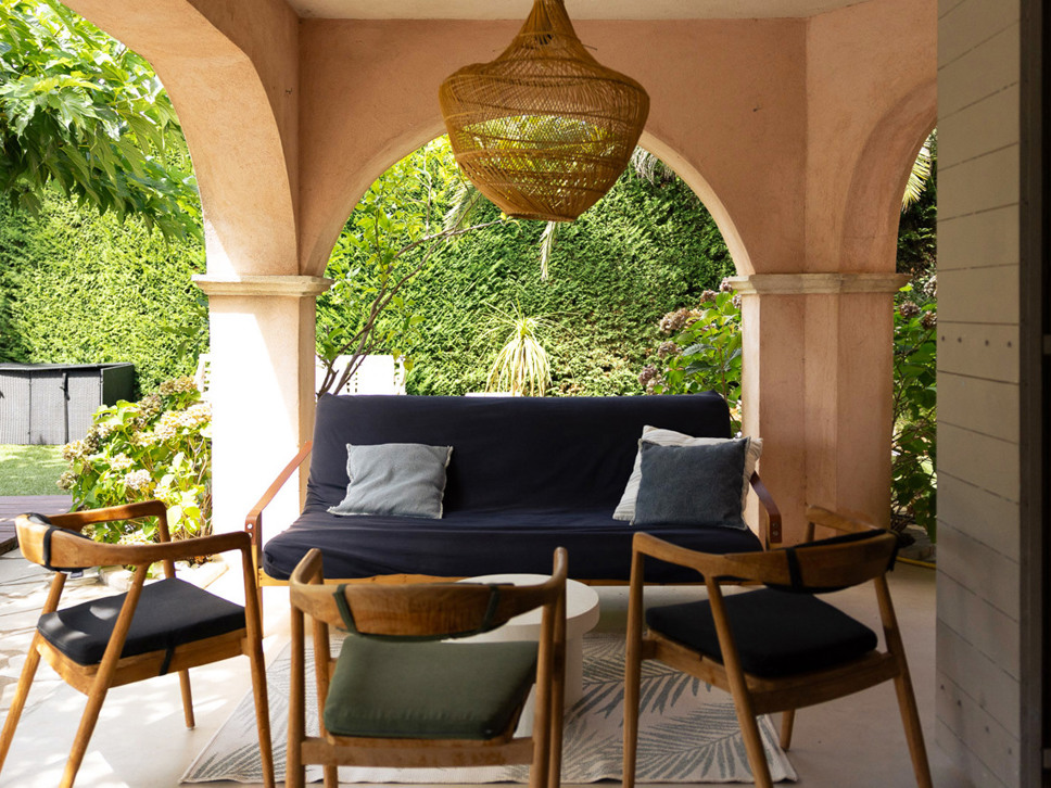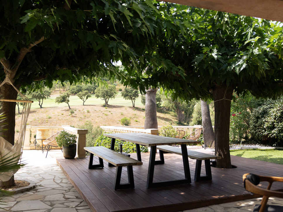 Vanuit de living komt u via openslaande deuren op het ruime terras en het zwembad. Erg prettig is de eettafel onder de schaduwrijke bomen dichtbij de keuken. De tuin is mooi aangelegd met palmen, veel verschillende bloemsoorten en een jeu de boules baantje, leuk voor de kinderen om te spelen.
