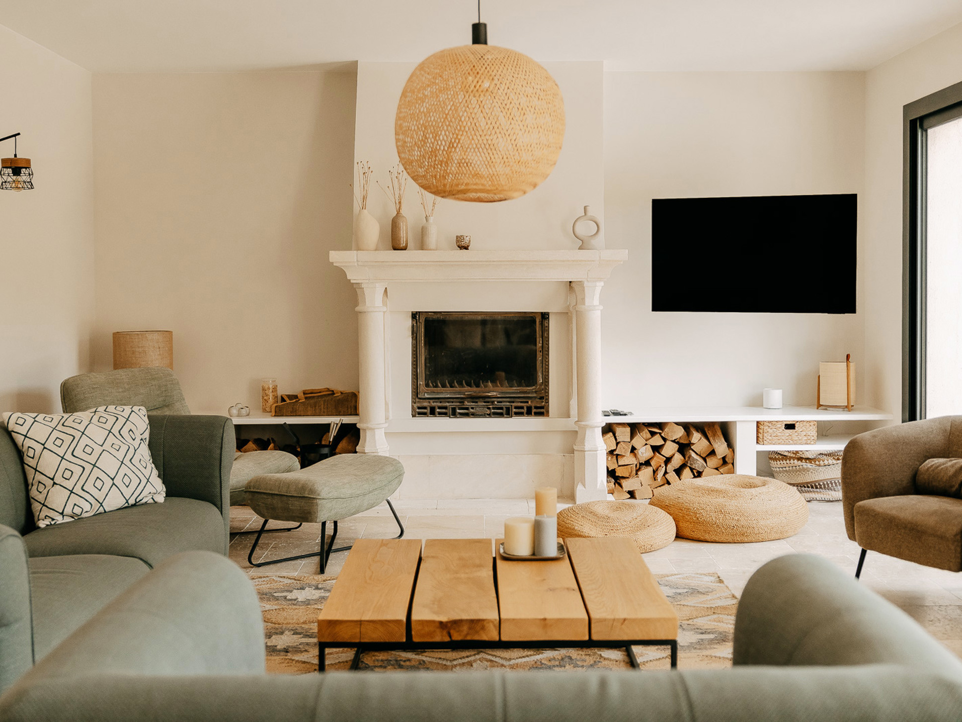De living is licht, ruim van opzet en fraai eigentijds ingericht met design zitmeubels. De complete keuken bevindt zich in het verlengde van de living. De woonkamer met openslaande deuren grenst aan het terras. De keuken ligt opent naar de overdekte terras met eettafel onder de bomen.