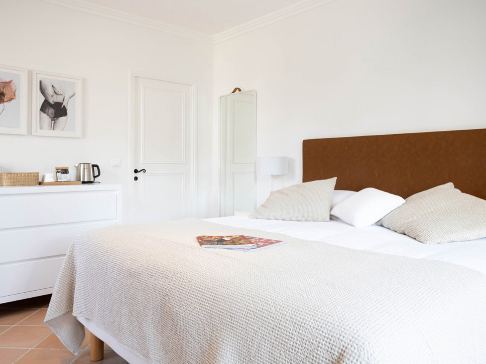 Er zijn 6 slaapkamers in deze villa. Op de begane grond bevindt zich slaapkamer 1; een ruime slaapkamer met tweepersoonsbed (180x200) alsook met een zithoek met TV en divan (slaapplaats voor kind). Ook is er een kinderbedje aanwezig. Naast deze slaapkamer bevindt zich een badkamer met douche en apart toilet. Slaapkamer 2 t/m 5 bevinden zich op de 1e etage te bereiken via een statige trap met originele Salernes tegels. Slaapkamer 2 en 3 zijn gelegen aan de zeezijde van de villa (met zeezicht) Op beide slaapkamers staat een tweepersoonsbed (160x200m). Verder is er op deze verdieping slaapkamer 4 met een tweepersoonsbed (160x200m) en een kleinere slaapkamer (Nr 5 met een stapelbed). De slaapkamers op deze verdieping delen een eenvoudige badkamer met douche.