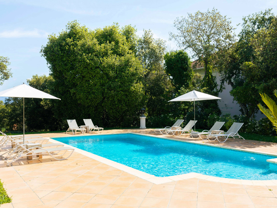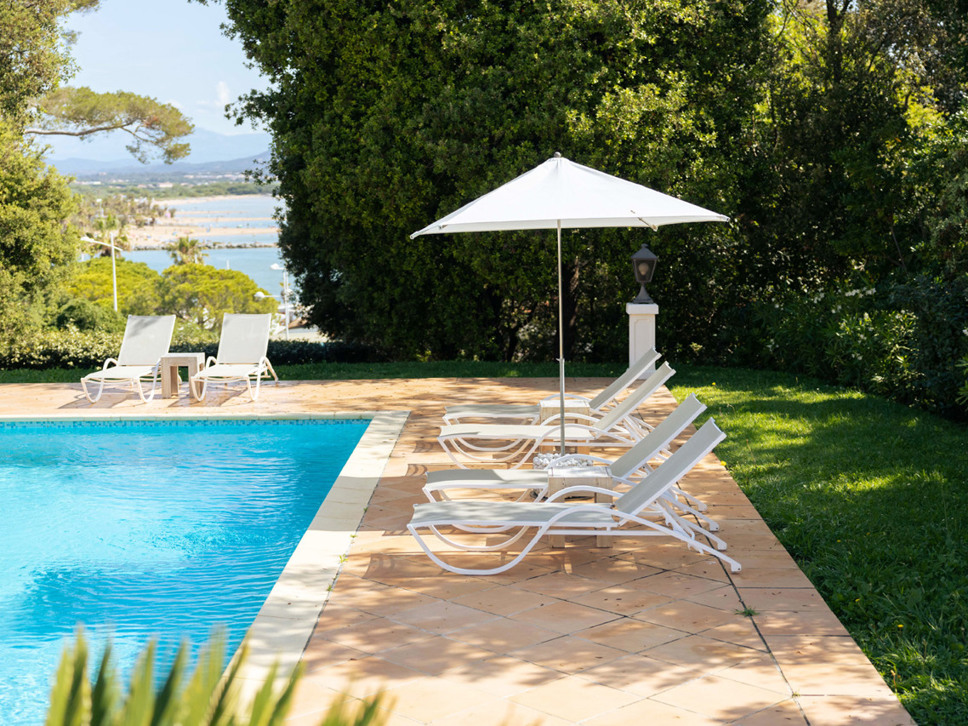 Via een trap komt u bij het ruime zwembad (5x12m) met zonneterras rondom en ligstoelen. Verwarmen van het zwembad is mogelijk. Een tweede trap verbindt het zwembad en zonneterras met de ruime tuin met (gedeeltelijk) gras. Ook pingpong tafel en jeux-de-boules baan aanwezig. Voor de villa zijn verschillende parkeerplaatsen.
