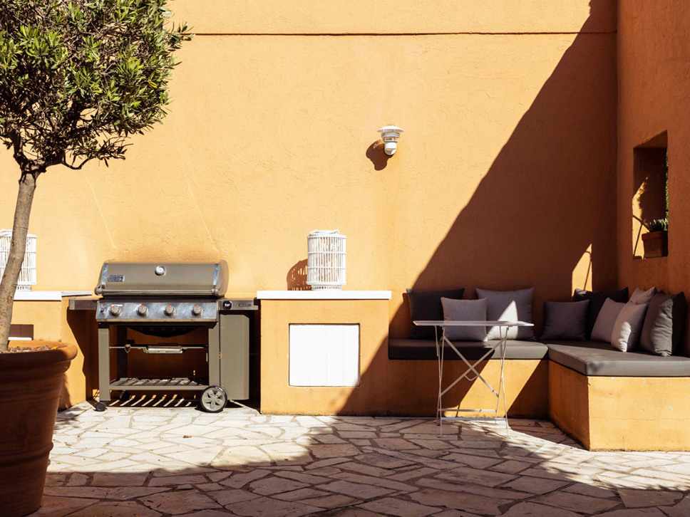 Vanuit de woonkamer is er rechtstreeks toegang tot een groot terras met luifel en twee grote eettafels. Rondom het zwembad (10x4m) is een zonneterras met luxe ligstoelen. Verwarmen van het zwembad is mogelijk. Gasbarbecue aanwezig. Bij het zwembad is ook een poolhouse. Verder is er nog een patio en verschillende zitjes. Ook pingpong tafel en jeux-de-boules baan aanwezig. Er zijn meerdere parkeerplaatsen.