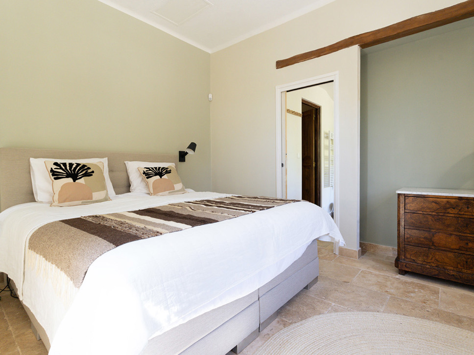 Slaapkamer 3,(begane grond, tuin- en zwembadzijde) Voorzien van airconditioning en een kingsize bed (180x200). Openslaande deuren naar het natuurstenen terras. Eigen badkamer met douche en wastafel. Plus een overdekt privéterras met toegang tot het grote terras en zwembad.