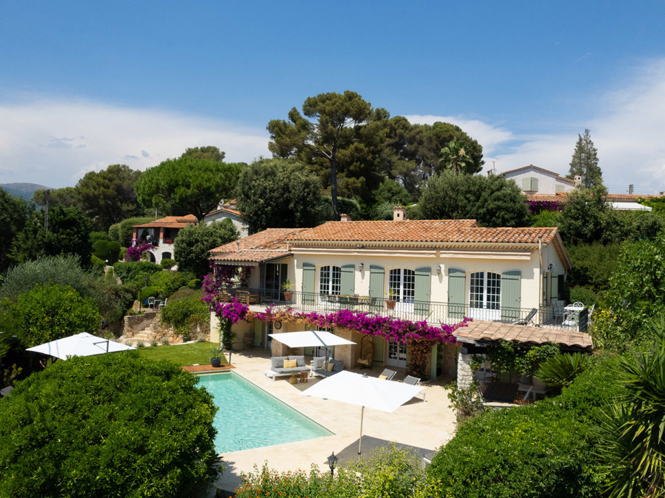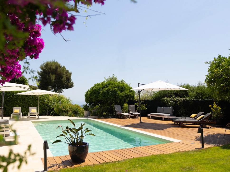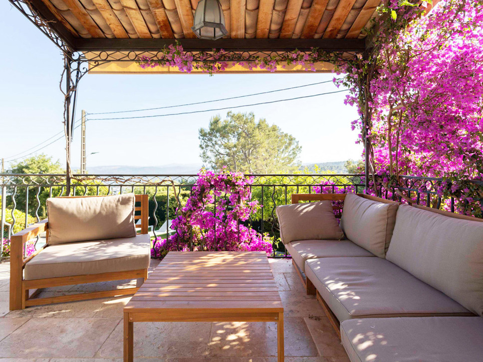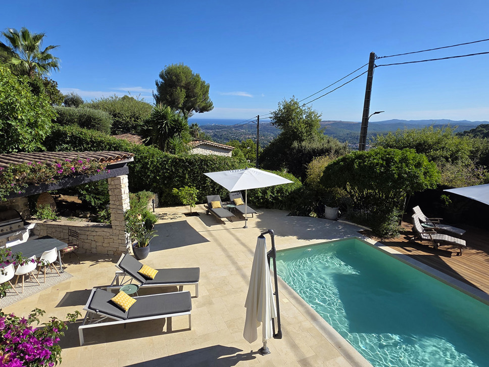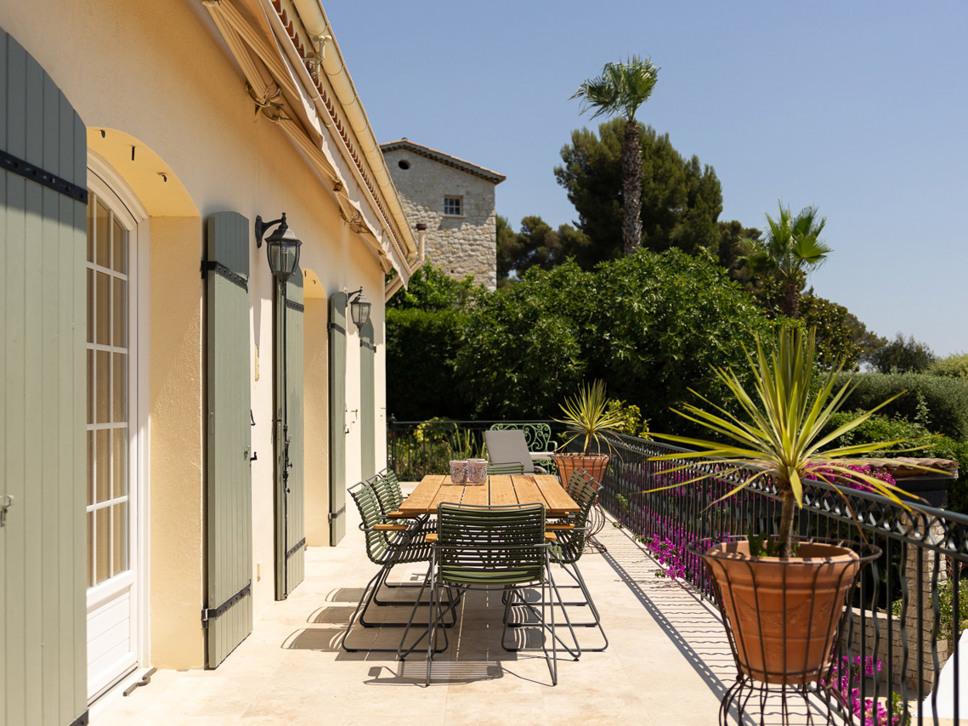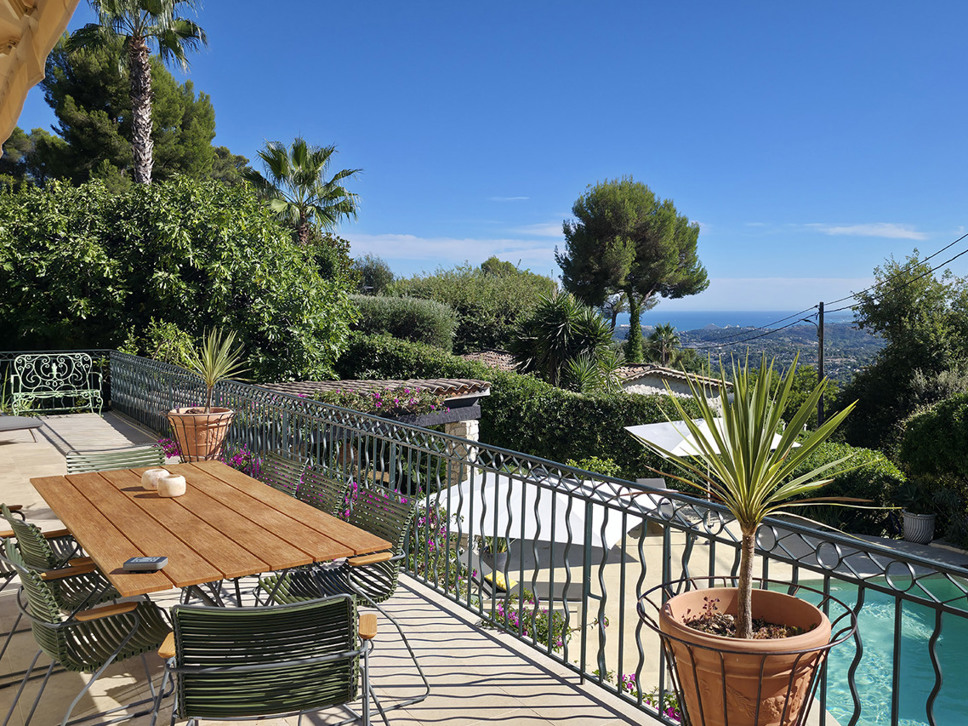 De villa biedt over de gehele breedte van de woning een mooi terras. Het uitzicht is over de vallei van Vence richting Middellandse Zee. Cap d’Antibes is vanuit de hele woonverdieping en keuken te zien.