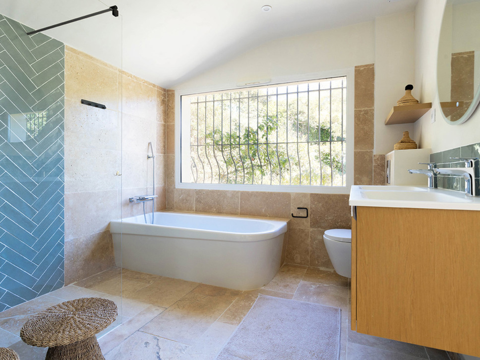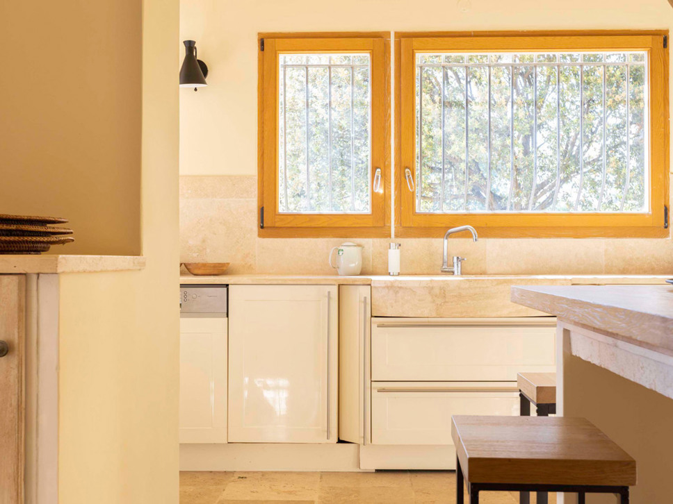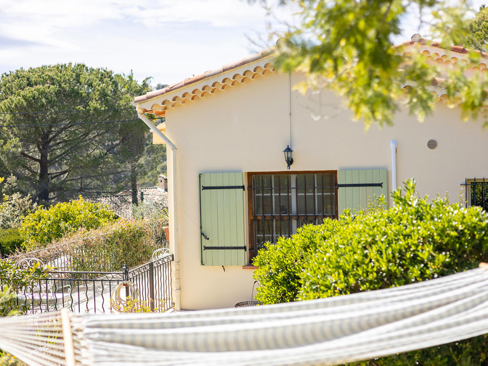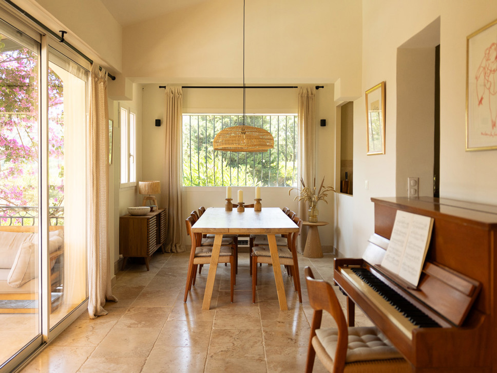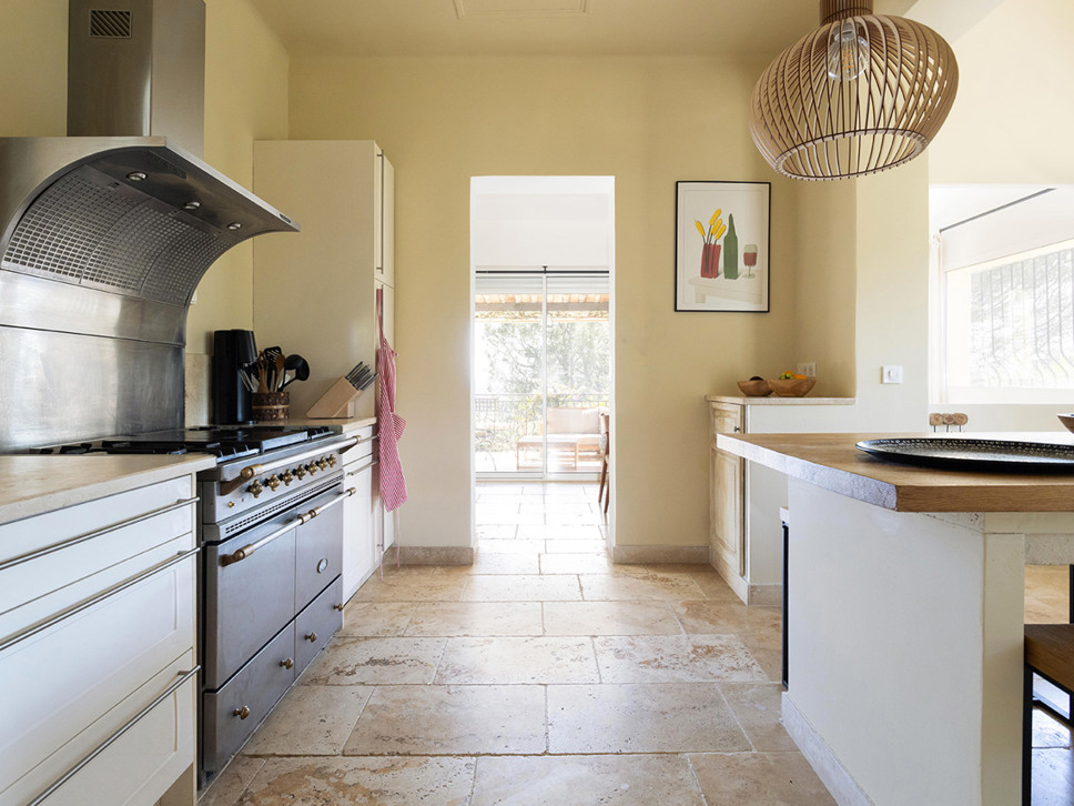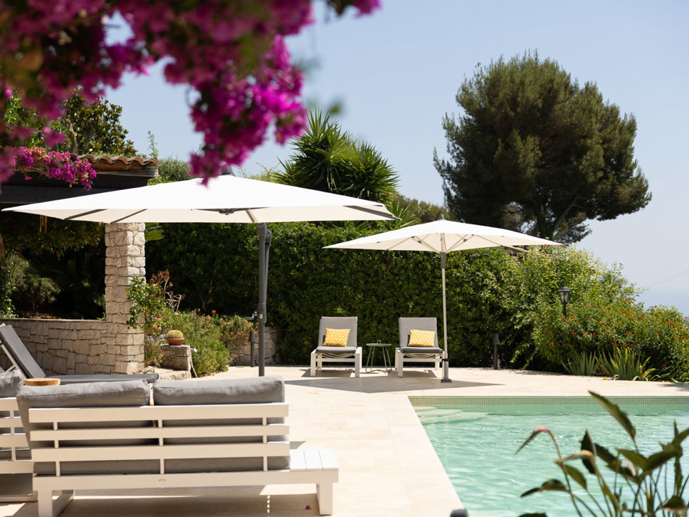 De villa biedt over de gehele breedte van de woning een mooi terras. Het uitzicht is over de vallei van Vence richting Middellandse Zee. Cap d’Antibes is vanuit de hele woonverdieping en keuken te zien.
