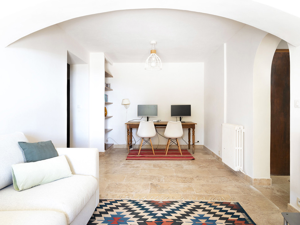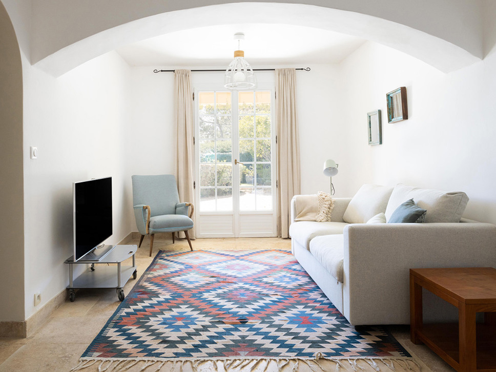 De ruime living, welke zich op de 1e verdieping bevindt, is sfeervol ingericht en heeft een zithoek rondom de open haard. De living is ook voorzien van airconditioning, die in de wintermaanden als verwarming kan worden gebruikt. Vanuit de woonkamer gaat u via openslaande deuren naar het aangrenzende terras met luxe loungeset onder de bougainville. In het verlengde van de zithoek is de eetkamer en de semi open keuken. De keuken is van alle gemakken voorzien; vaatwasser, een professioneel 5 pits gasfornuis/oven van het merk Lacanche, Nespresso apparaat, melkschuimer en magnetron. Wifi heeft overal in het huis goed bereik. Er staat zowel in de woonkamer als in de speelkamer een televisie met streamingsmogelijkheden, Netflix, apple tv etc.