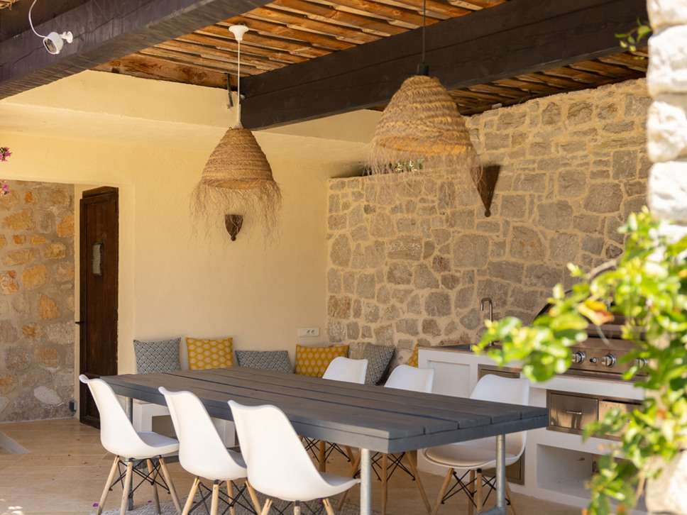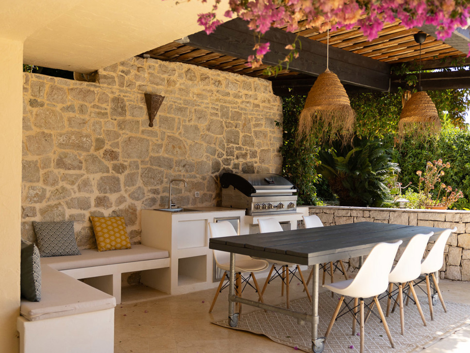 Zomerkeuken. Erg fraai vinden we de zeer goed uitgeruste zomerkeuken. Geheel overdekt, een eettafel en een verkoelende zithoek. De BBQ is indrukwekkend, van het merk Grandhall, Elite G 4 met 3 gas branders. De zomerkeuken is voorzien van een spoelbak, koelkast, bestek, borden, snijplanken, messen en glazen opdat u niet elke keer naar de keuken bij de living hoeft te gaan.
