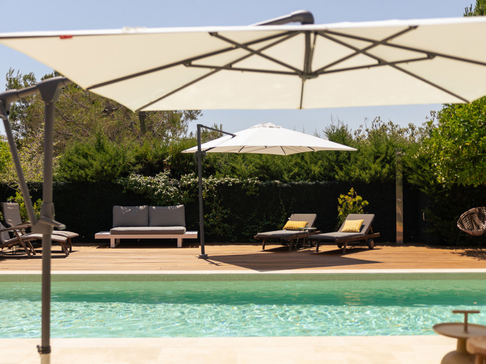 Privézwembad. De afmeting van het zwembad is ongeveer 10 x 4 meter en de diepte loopt van 120 naar 150 cm. Het zwembad is voorzien van een jetstream. Rondom het zwembad staan comfortabele ligstoelen en er is een loungehoek aanwezig met all weather kussens met parasol. Het op het zuiden gerichte zonneterras heeft een uitstekende zonligging. Voor uw comfort is er ook een buitendouche.