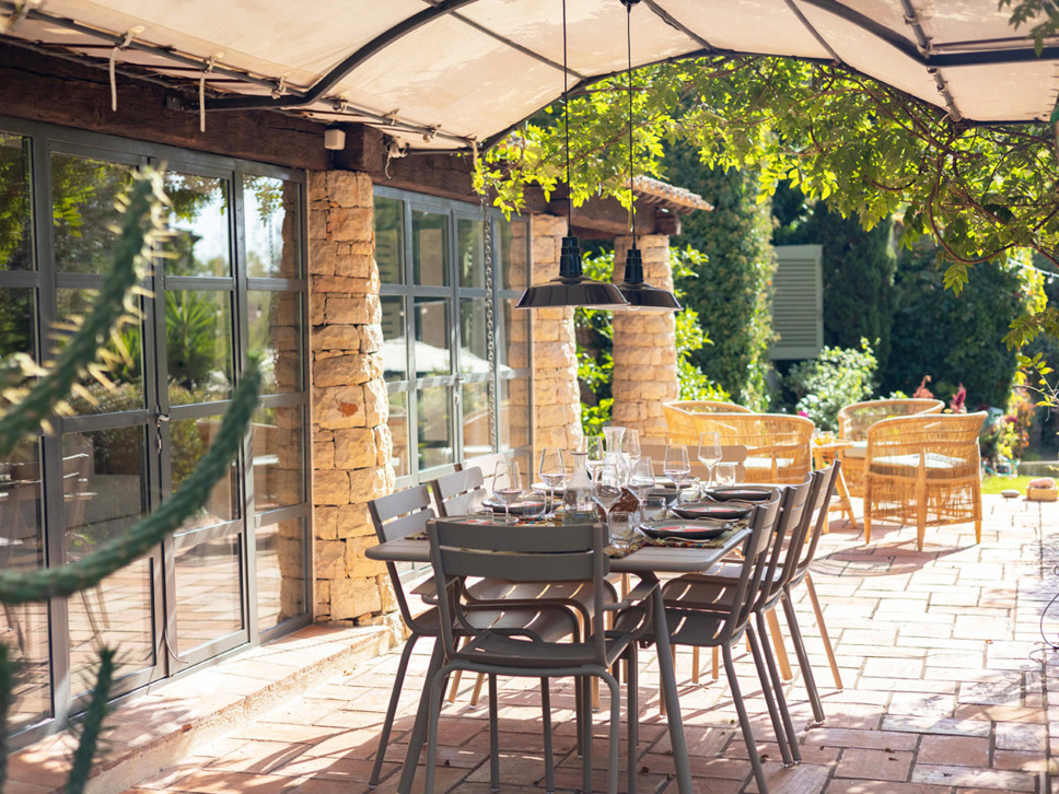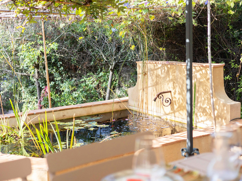 Openslaande deuren bieden vanuit de living toegang tot het terras. Op het terras kunt u heerlijk onder de pergola zitten. Naast een leuke loungeset is er ook een Fermob eettafelset. Een gezellig plekje om - samen met de goudvissen in de kleine vijver - gezellig samen te ontbijten of rustig een kopje koffie te drinken.
