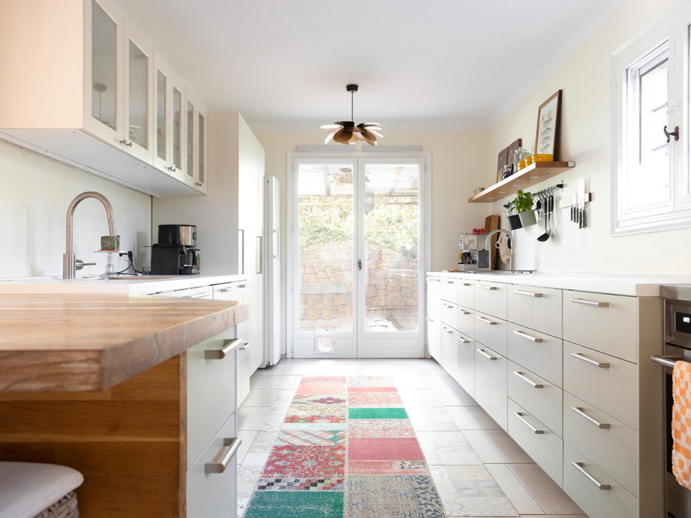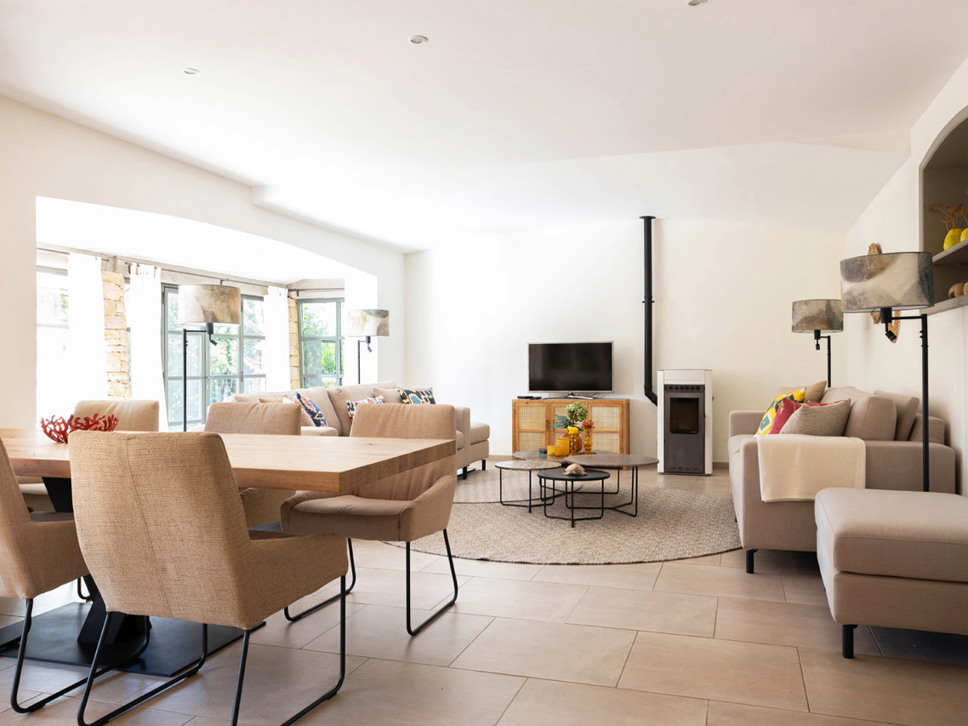 De prachtig bewerkte houten voordeur belooft veel goeds. En dat is ook zo vinden wij. De living is royaal en zeer sfeervol ingericht met comfy eigentijdse meubels. De open keuken is een feestje voor de kookliefhebber. Werkelijk alles is voorhanden. Een mooi SMEG fornuis, Amerikaanse ijskast (ijsblokjes en koud water), twee losse spoelbakken en veel en leuk servies.