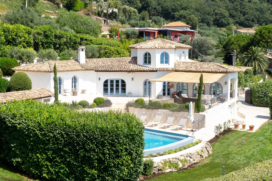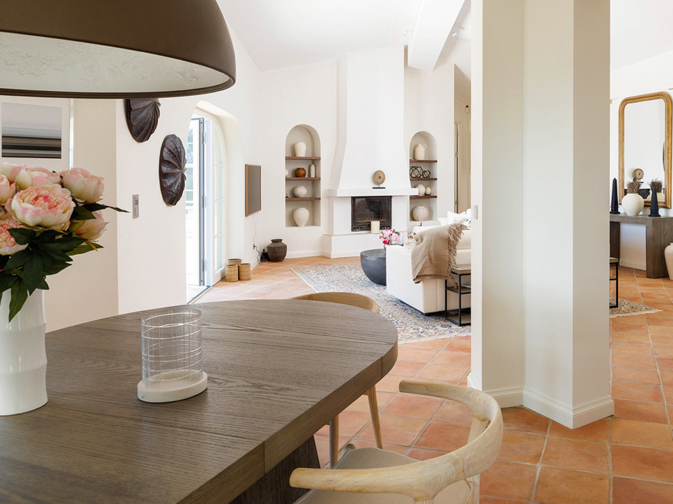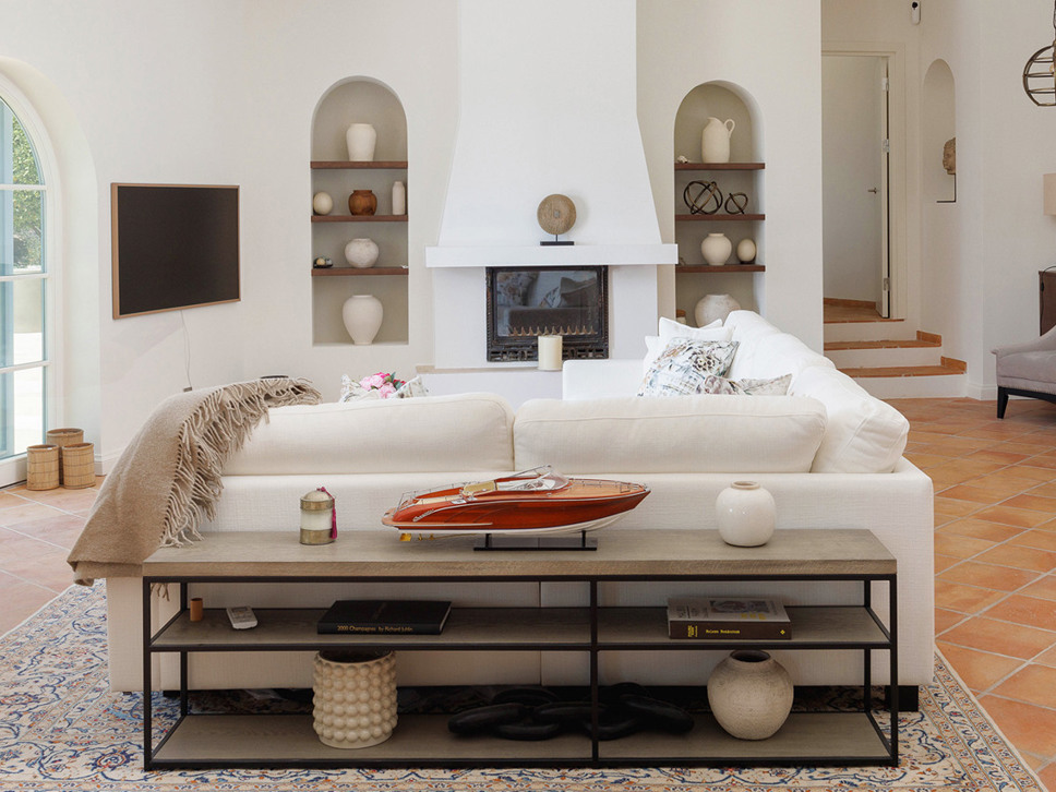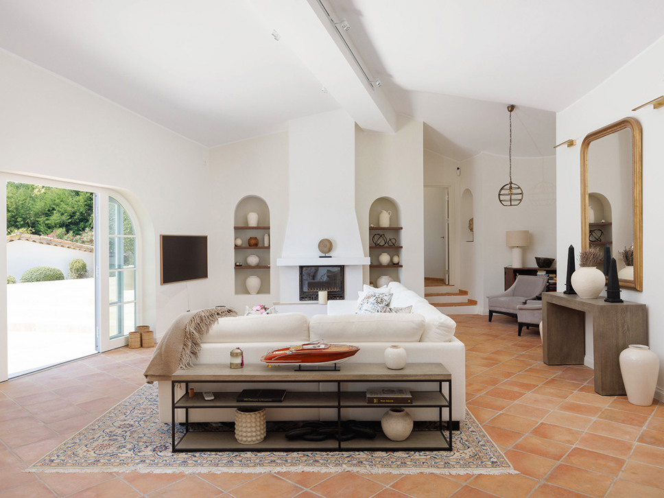 Ontspan in de royale living, waar luxe en eigentijdse meubelen en warme kleurenschema's een fijne Zuid-Franse sfeer creëren.
