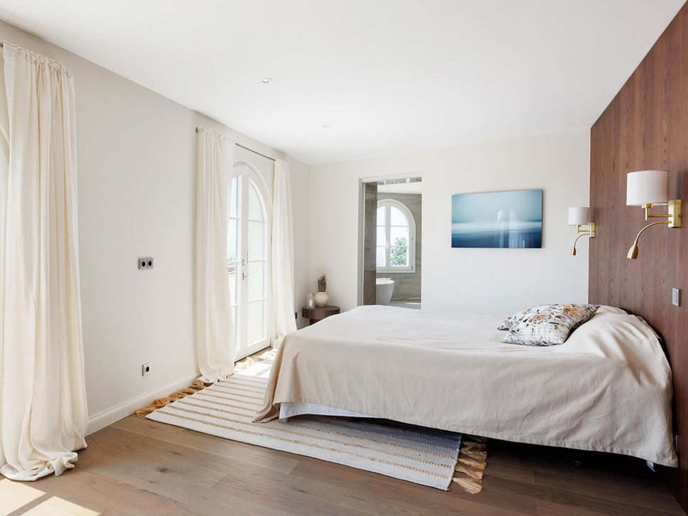 Slaapkamer 1 (begane grond) is een luxe ouder slaapkamer met een king-size bed (180x200), ensuite badkamer (wastafel, douche en W.C.), inloopkast, hoog plafond, en een groot terras met een 180-graden uitzicht op zee.