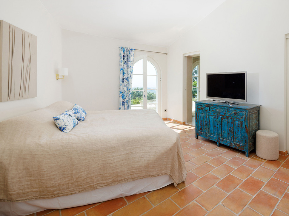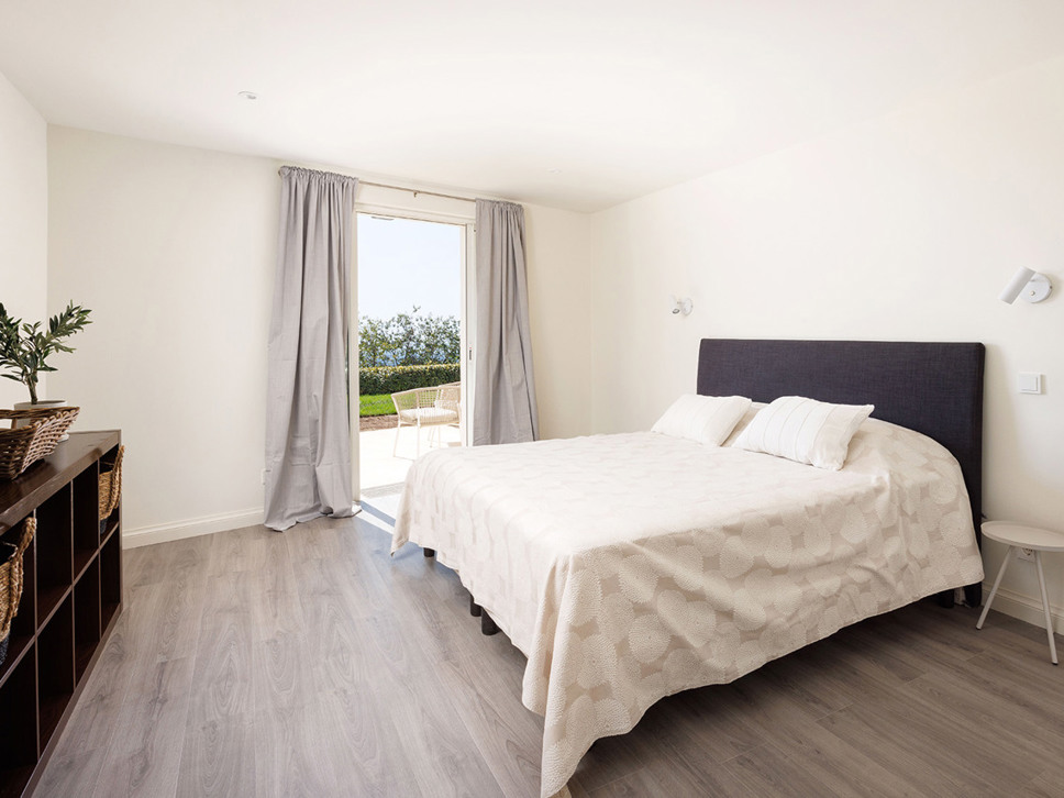 Slaapkamer 5 (begane grond) biedt een king-size bed (2x90x200) (desgewenst om te vormen tot twee eenpersoonsbedden), en-suite badkamer (wastafel, douche en W.C.), en een terras met panoramisch uitzicht op zee en bergen.