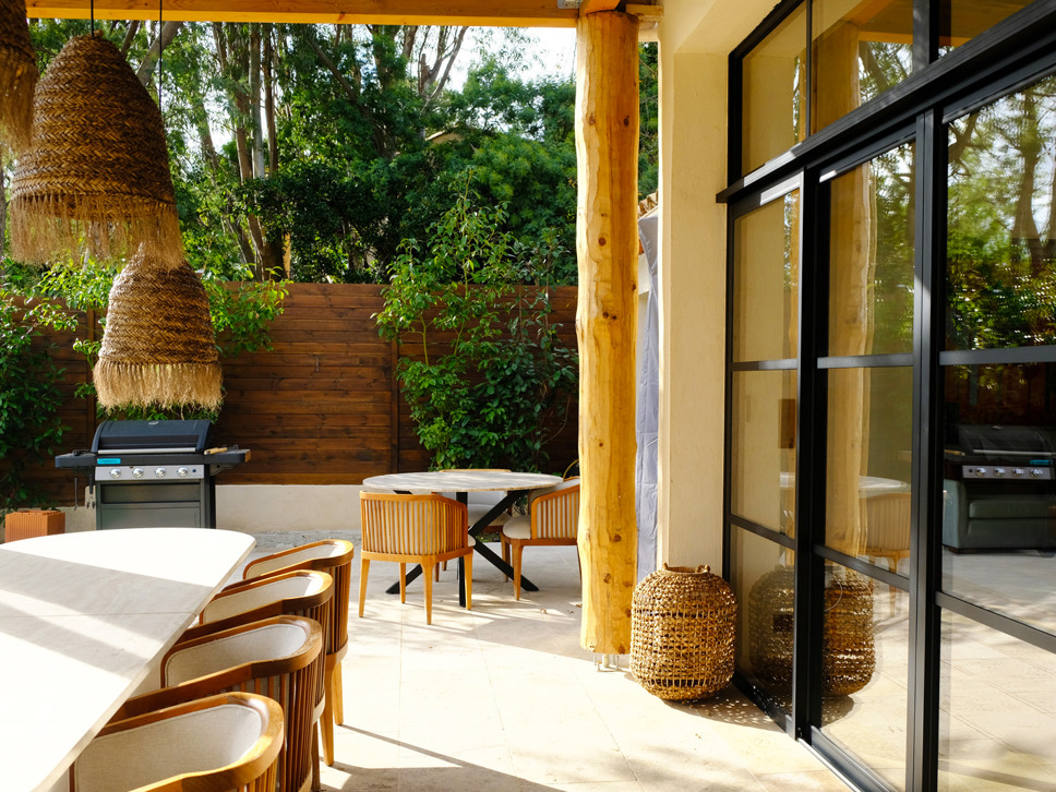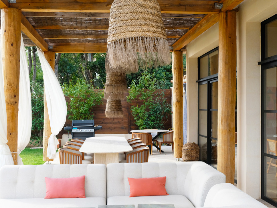 Hier vindt u ook de grote Weber BBQ en een eettafel met 10 zitplaatsen. Bij de comfortabele loungeset zorgen mooie linnen gordijnen desgewenst voor extra schaduw.