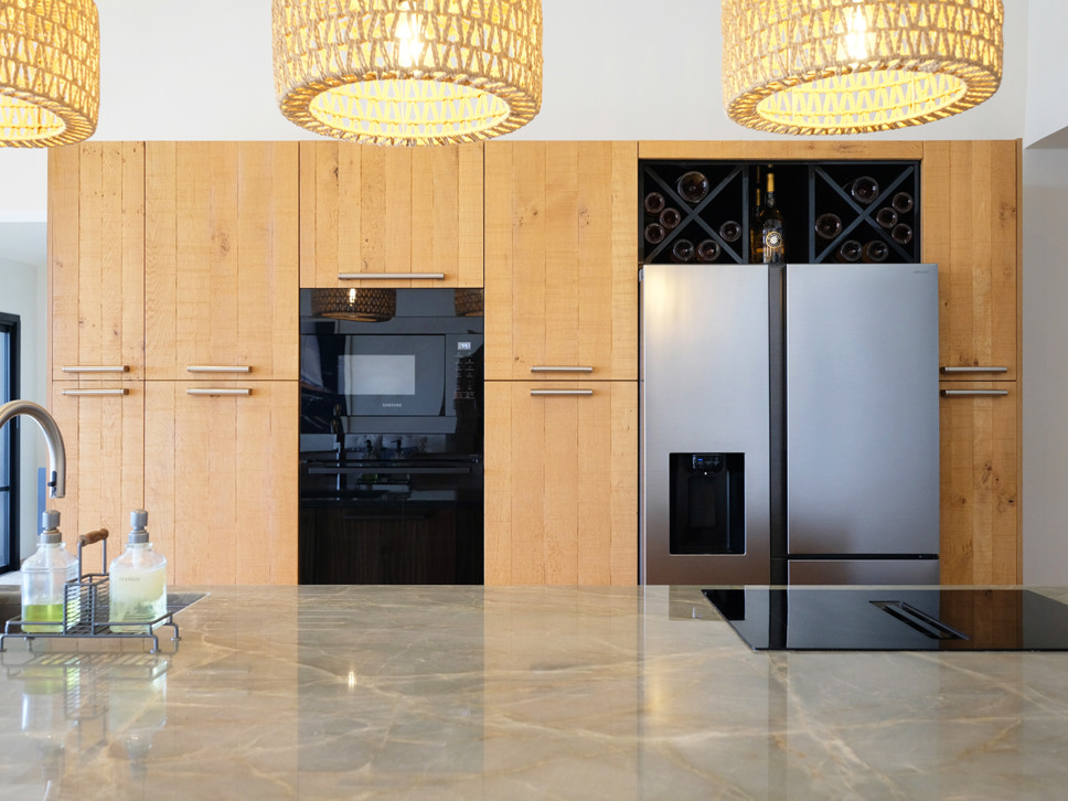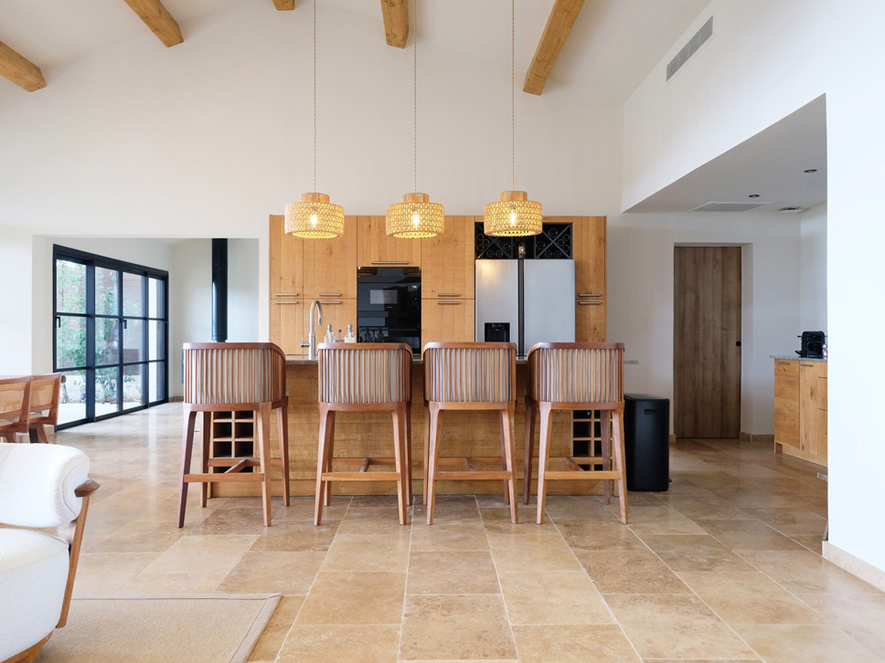 De open keuken is een XL leefkeuken met een groot kookeiland, ideaal om samen te koken en gezellig aan te schuiven. Dankzij de houtaccenten heeft de ruimte een warme, bijna tropische sfeer.
