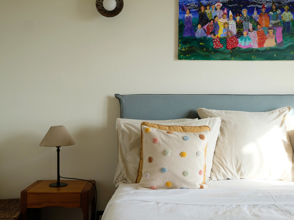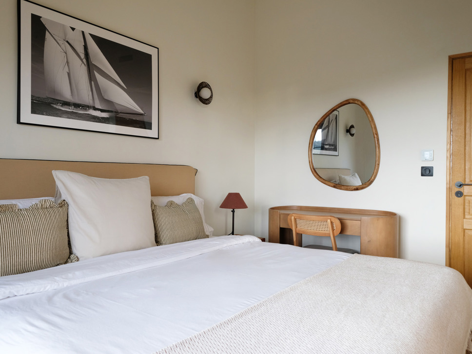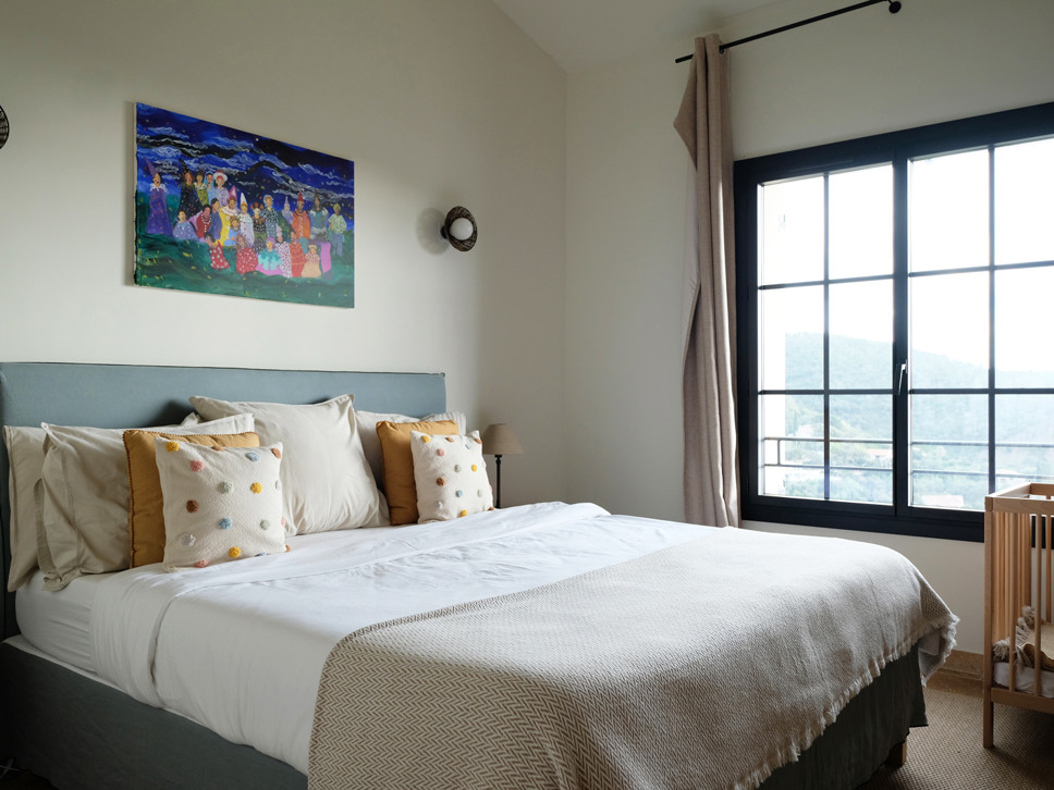 Slaapkamer 4, gelegen op de 1e verdieping, beschikt over een tweepersoonsbed (180x200). De badkamer is privé op de gang (dubbele wastafel, douche en W.C). De slaapkamer biedt fraai zicht op de Middellnadse Zee.