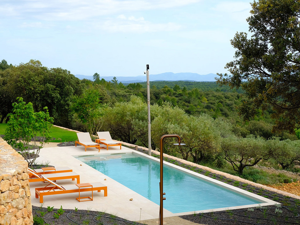 Nieuw. Uniek en schitterend gelegen villa met privé zwembad in Tourtour, Provence. Modern ingericht. Volledige privacy. Adembenemend 180° panoramisch uitzicht van uit "de Hemel van de Provence". Geschikt voor 8 tot 10 personen.