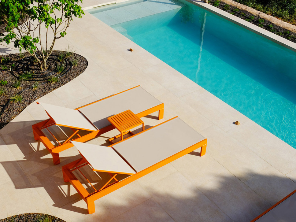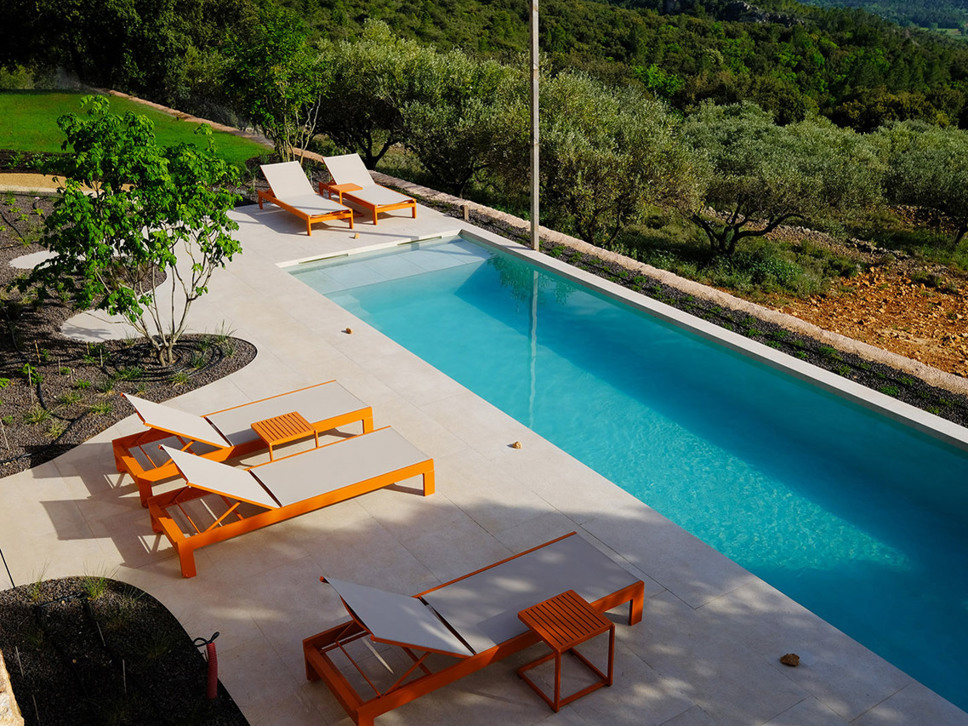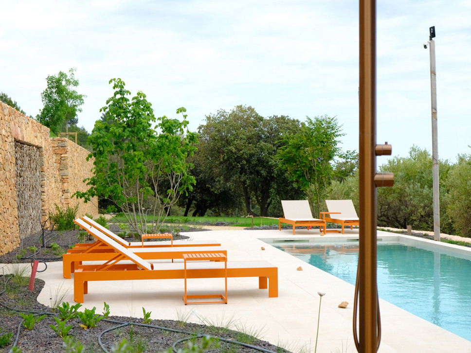Het privézwembad (11 x 3 m) ligt iets lager dan het hoofdterras en is stijlvol ingebed in een architectonisch aangelegd zonneterras met luxe ligbedden en een parasol. Het zwembad is verwarmbaar, heeft een diepte van 1.50 m en is voorzien van een buitendouche. Dankzij de zuidelijke ligging geniet u hier de hele dag van de zon.