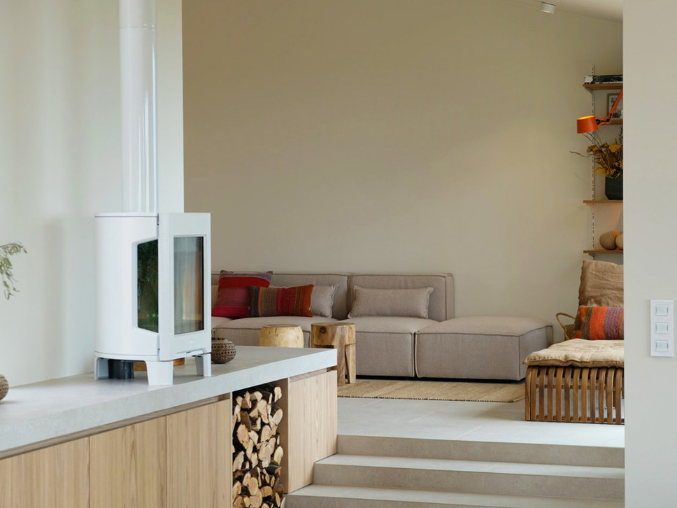 In de korte zijde van de L bevindt zich de gezellige tv-hoek. Een comfortabele sofa en een designstoel staan strategisch gepositioneerd voor het grote raam – dé plek om in alle rust te genieten van het unieke uitzicht.