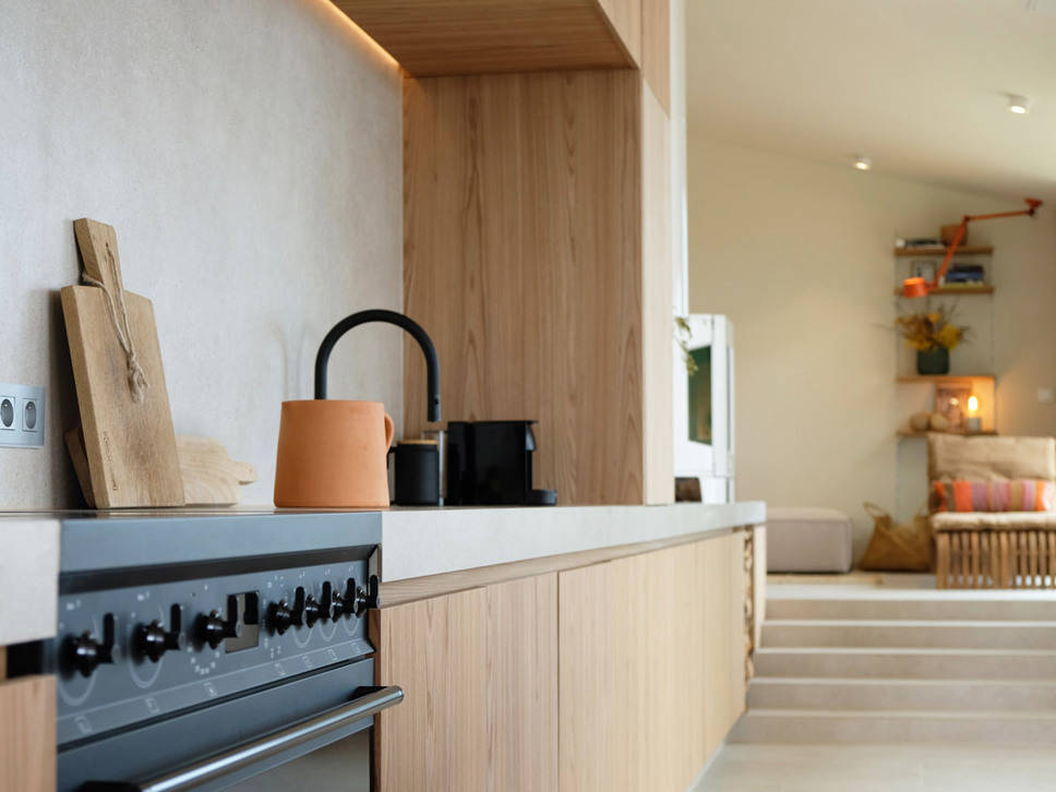 In het hart van de L ligt de riante woonkeuken – een architectonisch hoogtepunt. Denk aan hoge plafonds, maatwerk inbouwkasten en een strak vormgegeven kookeiland. De grote eettafel biedt plaats aan tien personen en is de perfecte plek voor lange avonden met goed gezelschap. Dankzij de hoge glaspartijen en schuifpuien vloeien binnen en buiten naadloos in elkaar over. De keuken is van alle gemakken voorzien, met onder andere 2 koelkasten waarvan 1 met diepvriezer, een combi-oven en een Nespressoapparaat.
