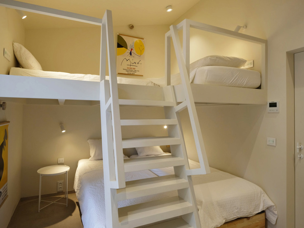 Slaapkamer 4, is de ruime familiekamer. Hier vindt u een luxe op maat gemaakt stapelbed geschikt voor 4 personen. De afmeting van de bedden is (4x90x200) Met een eigen badkamer (douche en wastafel) is dit de ideale kamer voor kinderen. Desgewenst kunnen de 2 éénpersoonsbedden, beneden ook opgemaakt als tweepersoonsbed dus ook geschikt voor volwassenen hetgeen deze kamer omtovert tot een familiekamer.