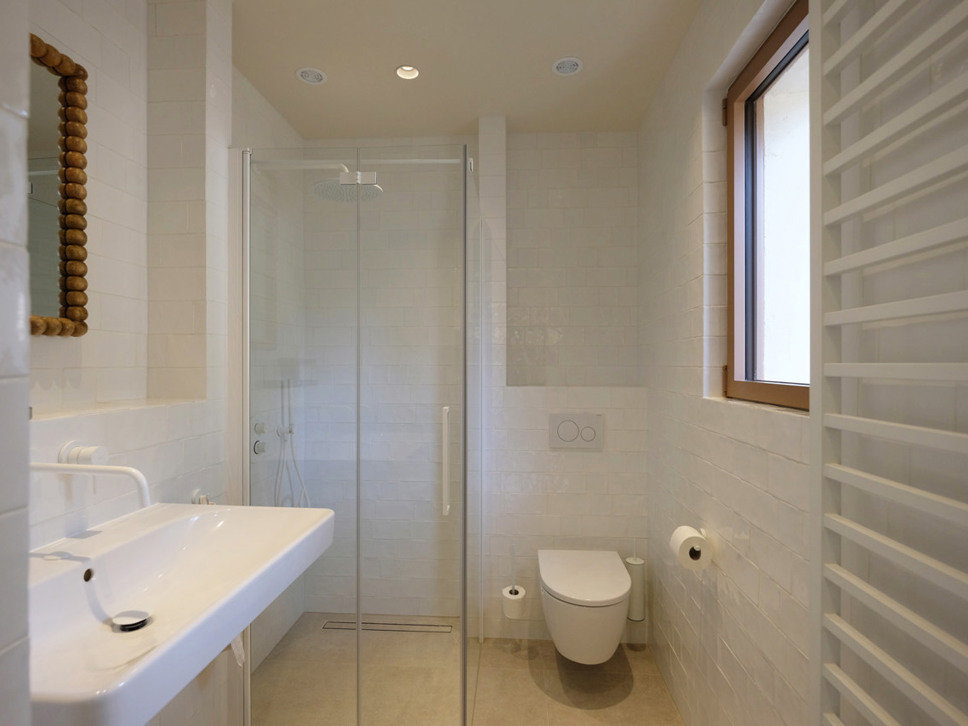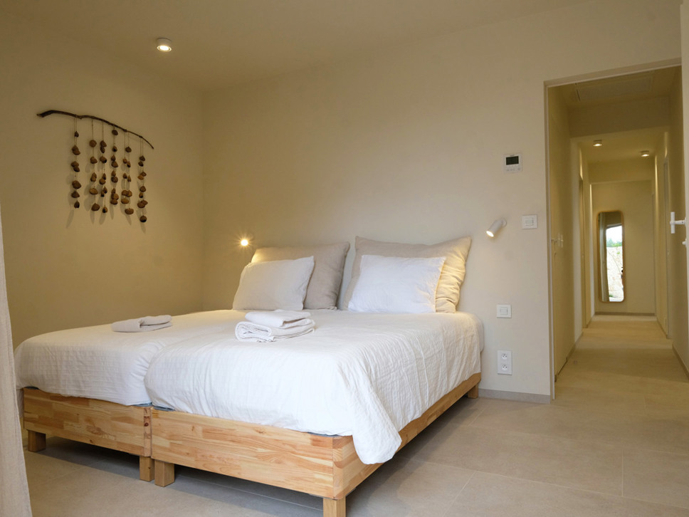 Slaapkamer 3, is eveneens uitgerust met twee eenpersoonsbedden (2x90x200), opgemaakt als tweepersoonsbed, en heeft een eigen badkamer met inloopdouche en wastafel. Ook deze kamer opent naar de tuin aan de zwembadzijde.