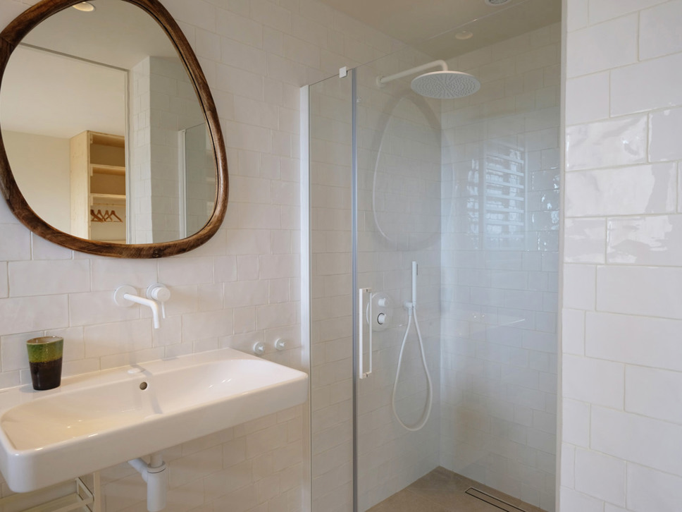 Slaapkamer 2, beschikt over twee eenpersoonsbedden (2x90x200), opgemaakt als tweepersoonsbed. De en-suite badkamer heeft een inloopdouche en een wastafel. Deze slaapkamer grenst aan de tuin aan de zwembadzijde.