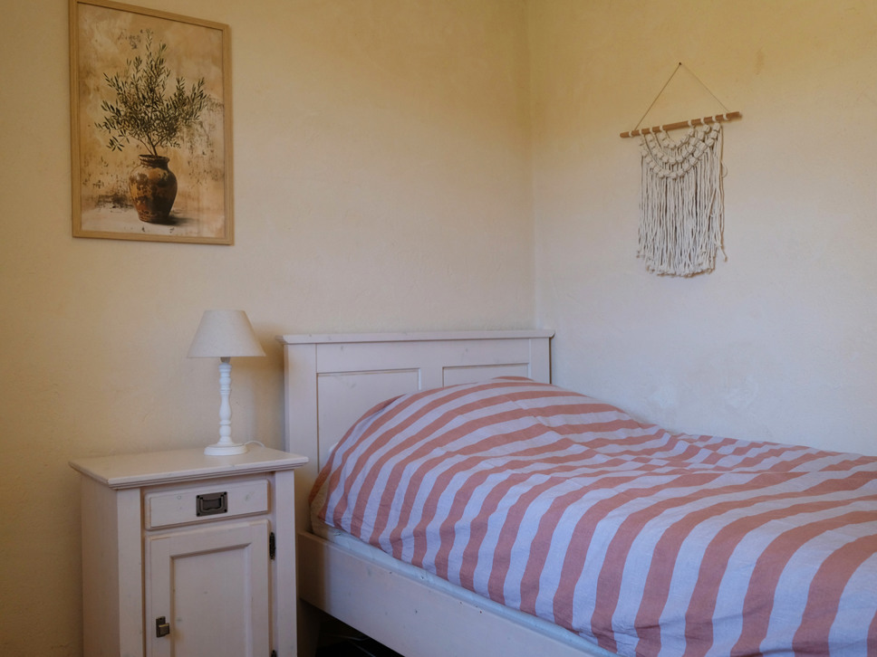 Slaapkamer 4, gelegen op de 1e verdieping, is een eenpersoonsslaapkamer ook voorzien en airconditioning. Ook deze slaapkamer maakt gebruik van de badkamer (dubbele wastafel, een inloopdouche en een W.C.) op deze verdieping.