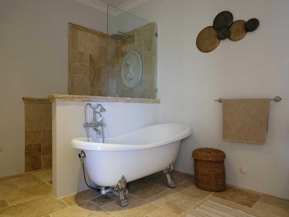 Slaapkamer 1, begane grond, is een tweepersoonsslaapkamer met (inbouw)kasten en airconditioning, en beschikt over een royale en-suite badkamer (wastafel, een ligbad, inloopdouche en een W.C.). Deze slaapkamer is enkel via buiten om te bereiken.