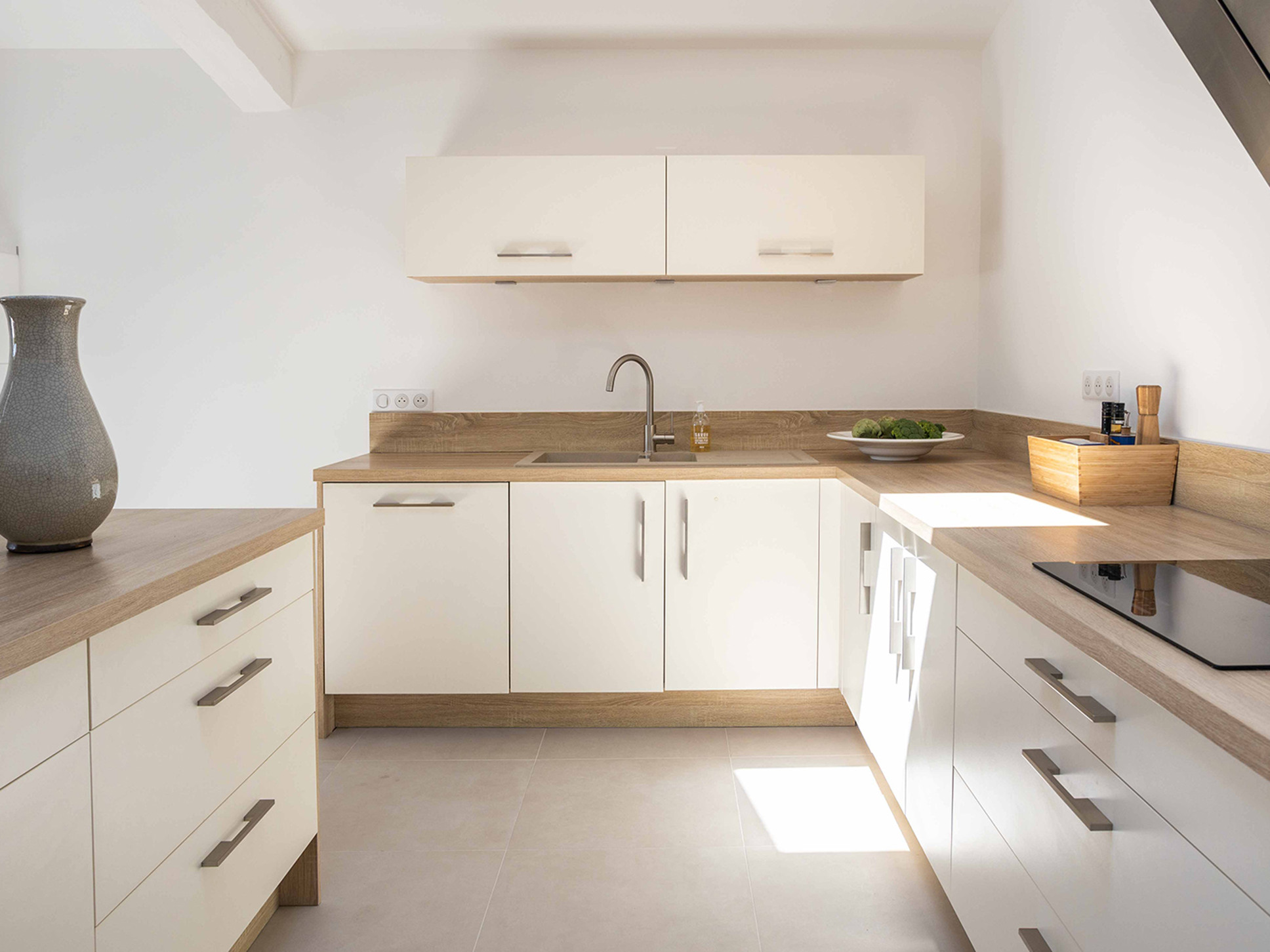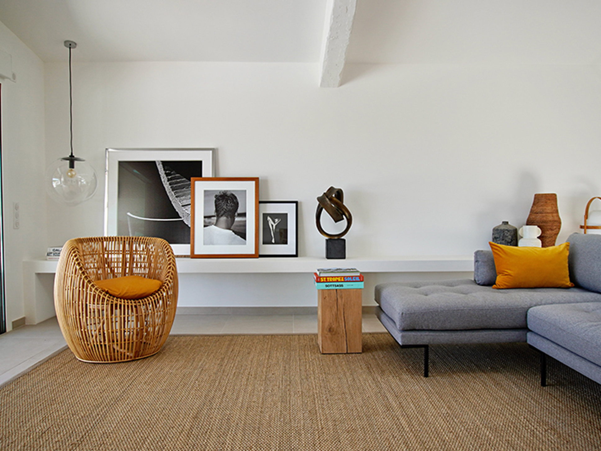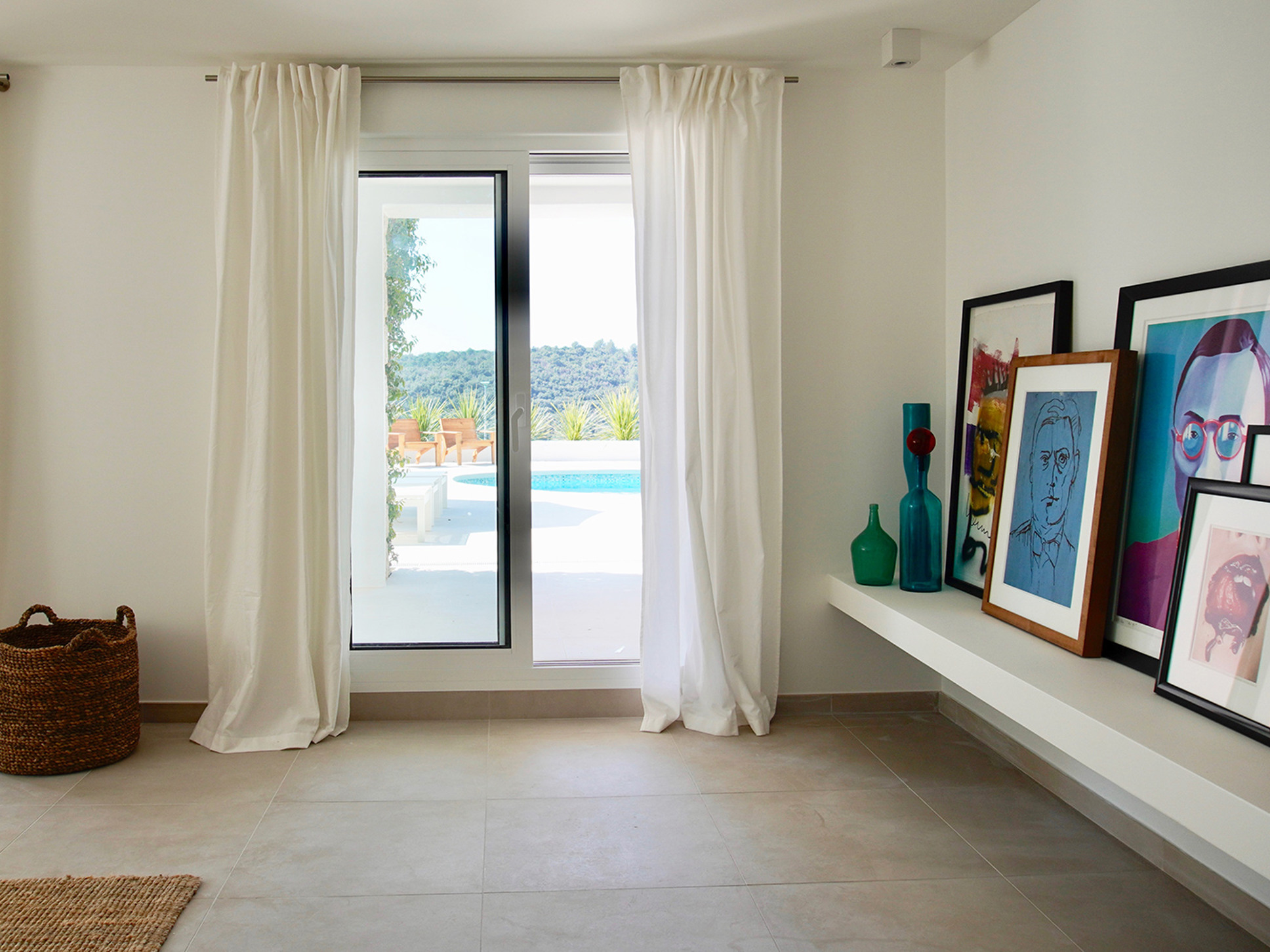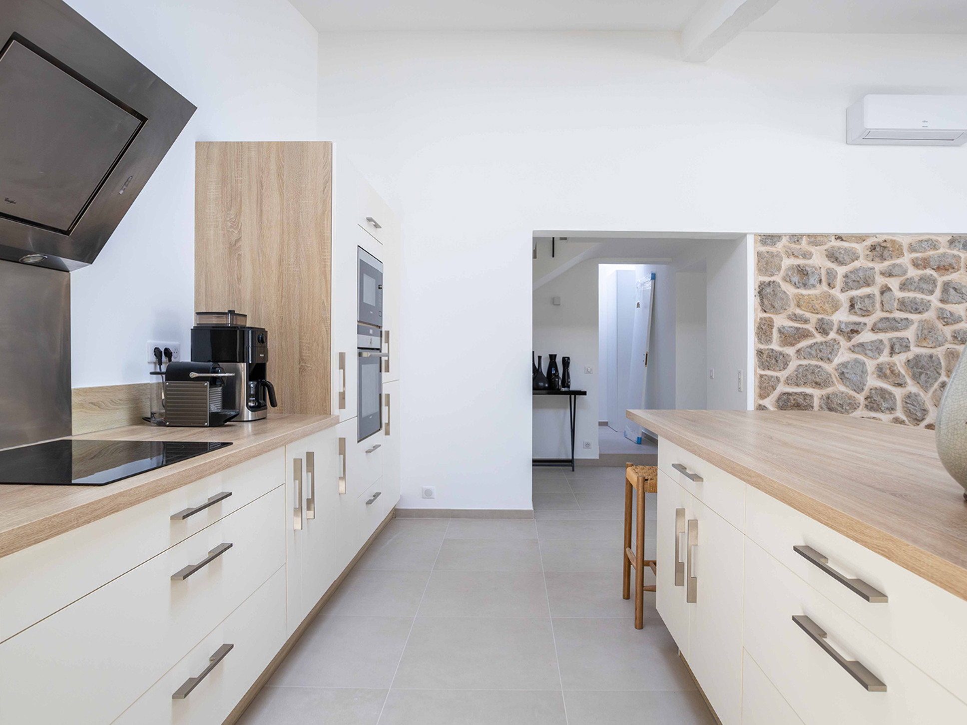 De living is licht, ruim opgezet en eigentijds ingericht met designmeubelen en kunstvoorwerpen. In het verlengde van de living bevindt zich de moderne, volledig uitgeruste keuken die uitkijkt over het terras en het zwembad. Zowel de living als de keuken zijn voorzien van airconditioning. Op de eerste verdieping bevindt zich bovendien een tweede living met LCD-tv. Dankzij de glasvezelverbinding beschikt de villa over uitstekend wifi, zeldzaam goed in Zuid-Frankrijk.