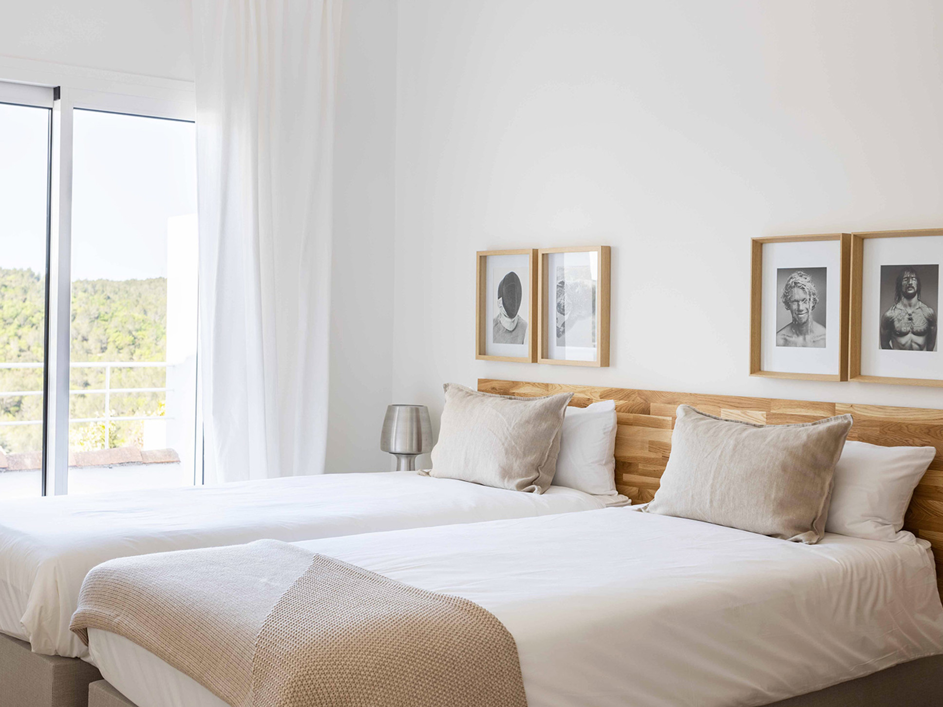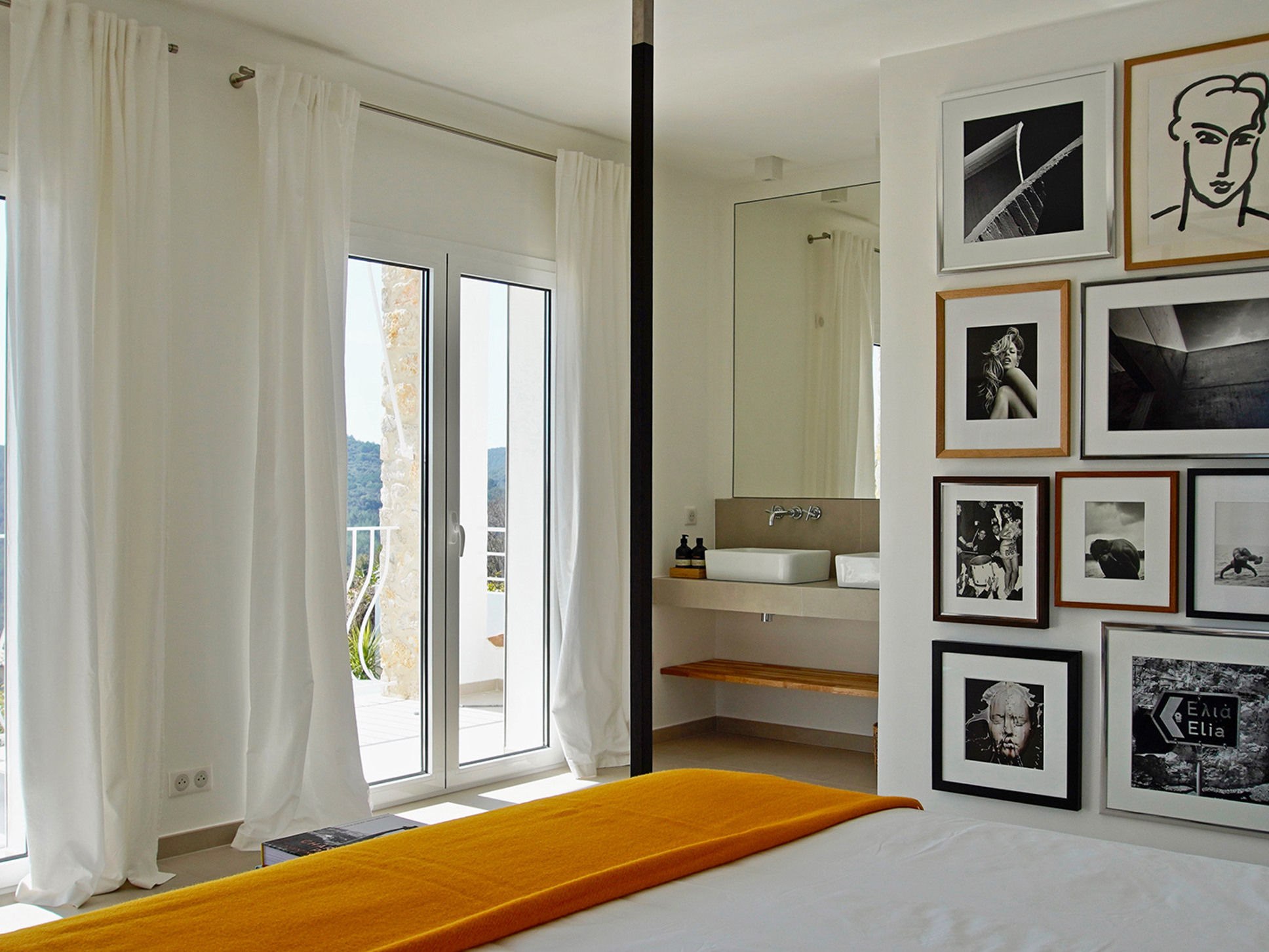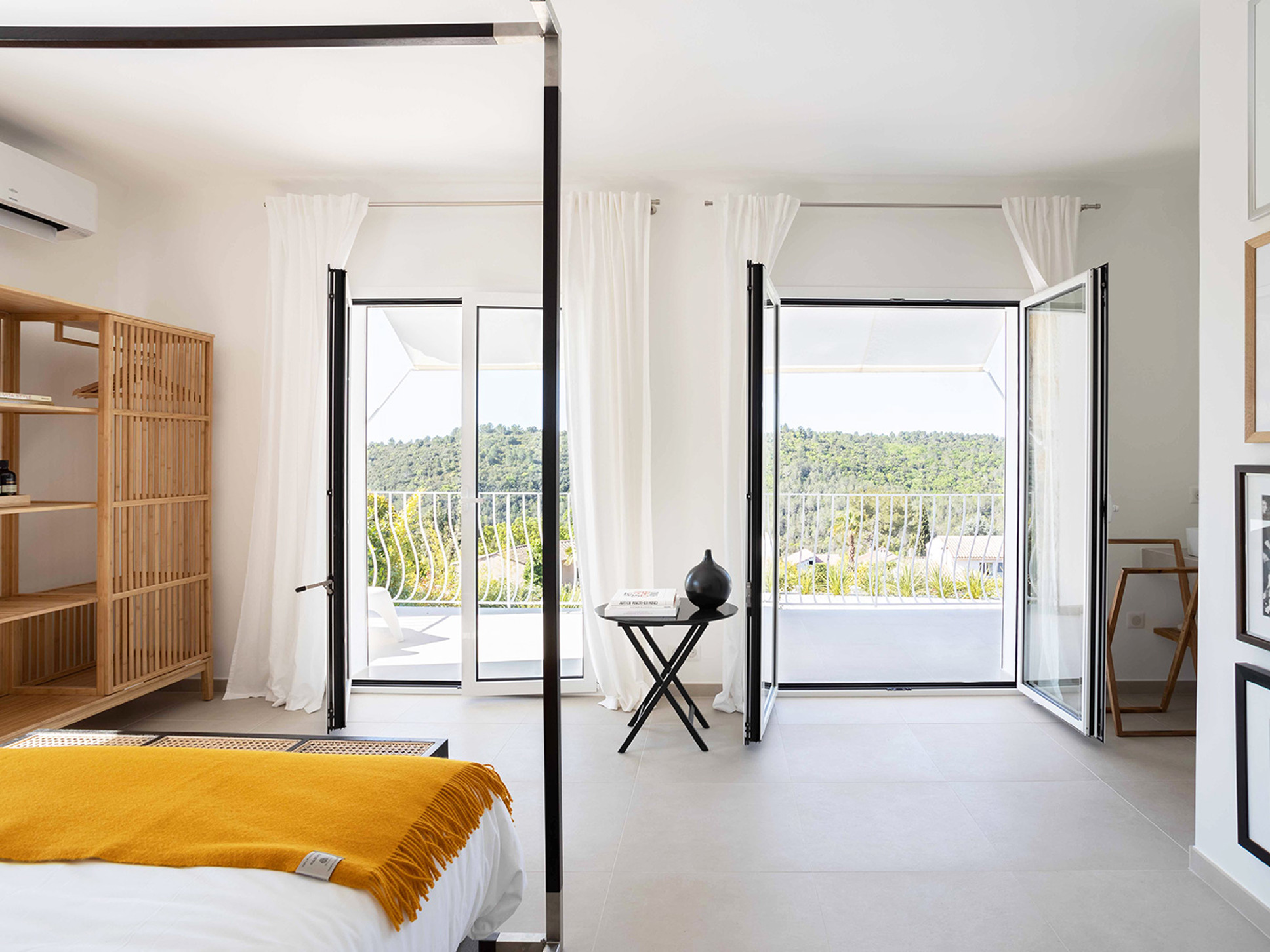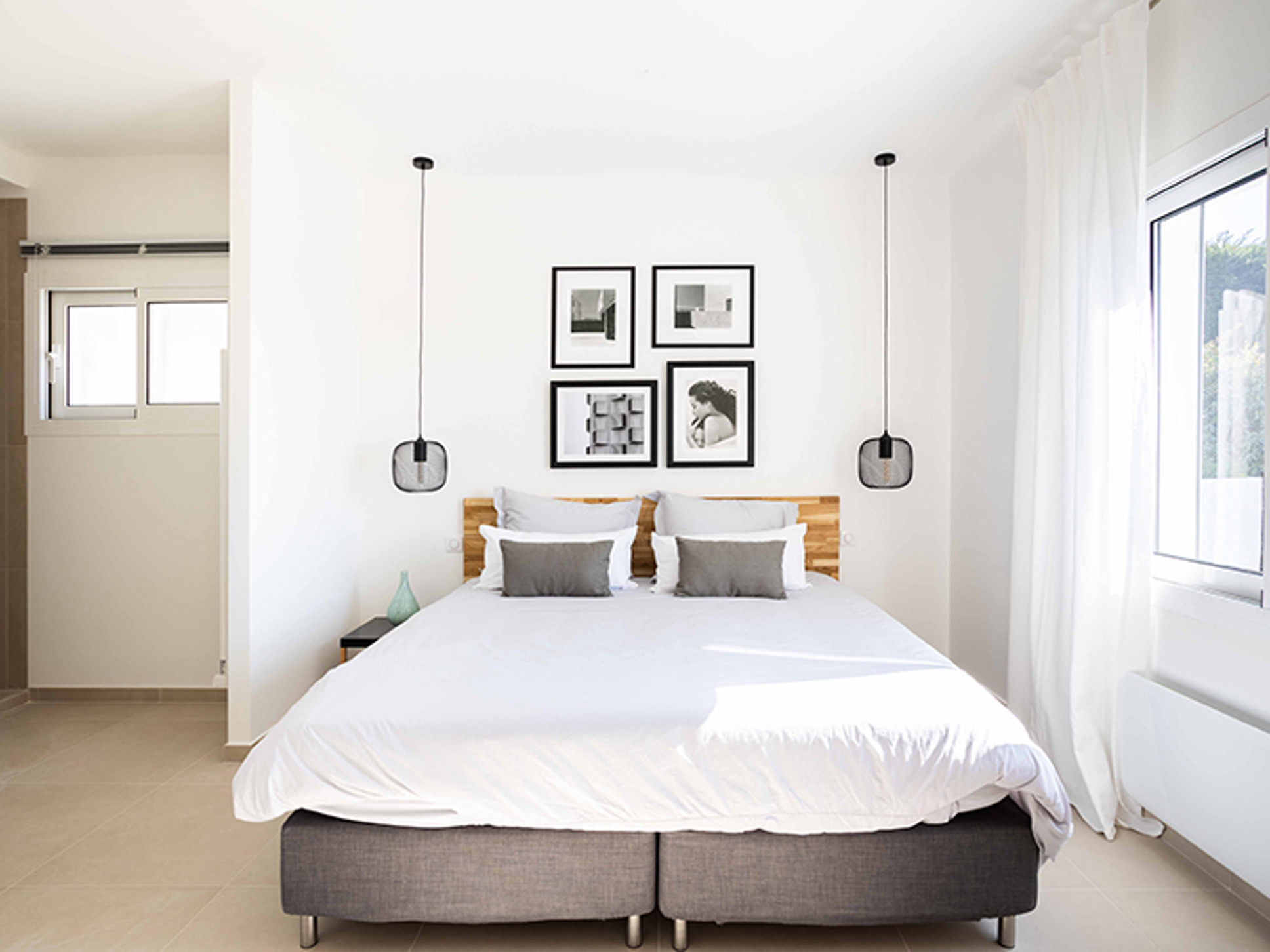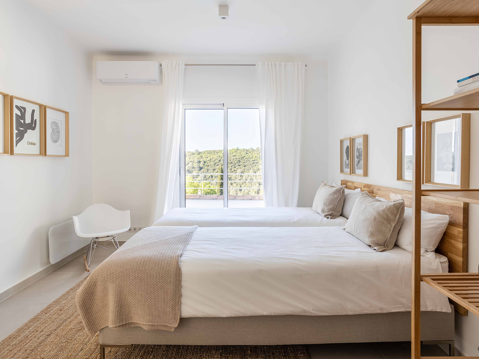Slaapkamer 3, ligt eveneens op de eerste verdieping en beschikt over een tweepersoons boxspring (180x200). Ook hier is de badkamer en-suite uitgerust met regendouche, design wastafels en een separaat toilet. Deze kamer heeft eveneens toegang tot een privé balkon met uitzicht over het zwembad en het omliggende landschap.