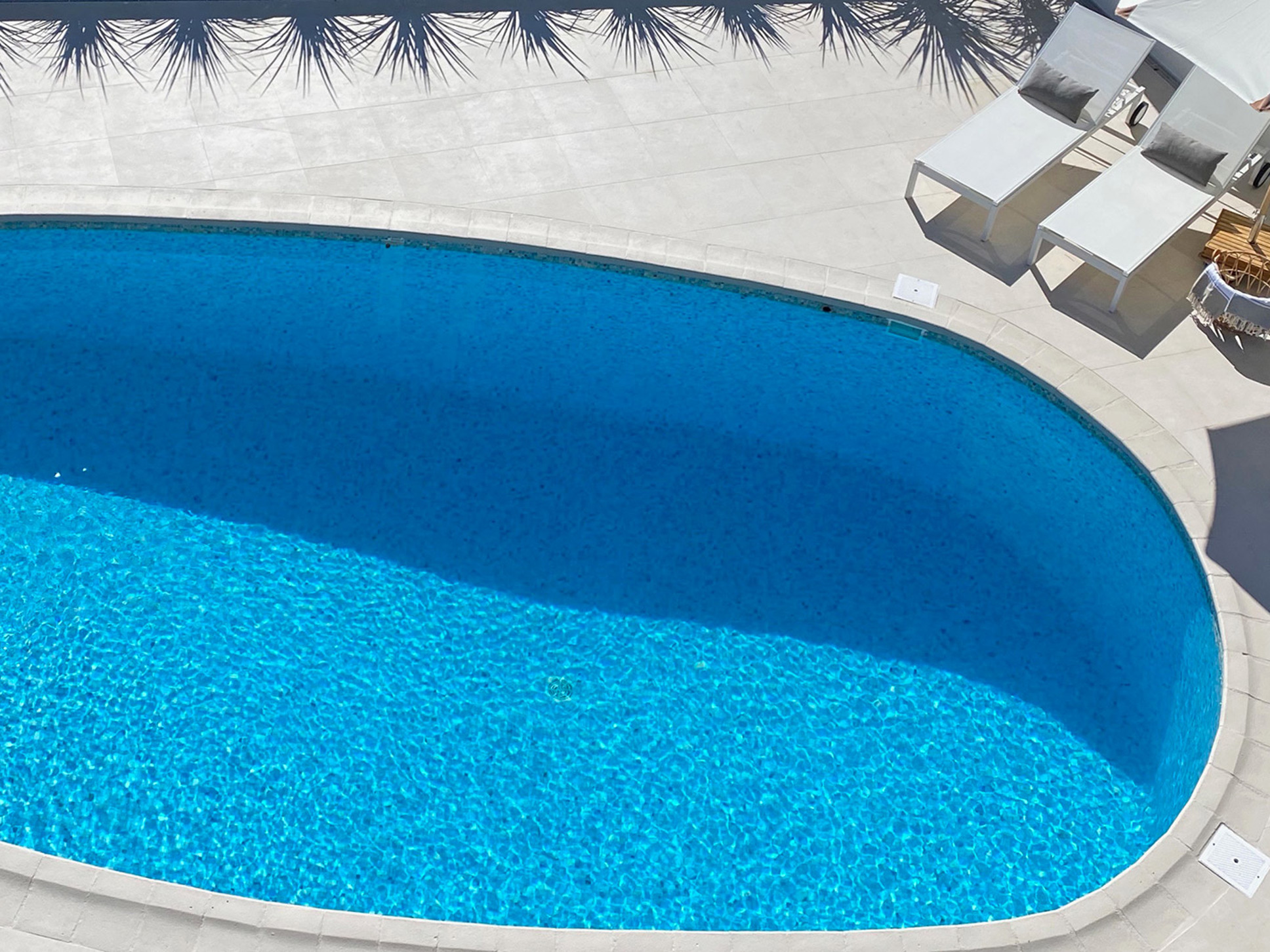 Het zwembad ligt vlak voor het overdekte terras en is heeft een fraai ovaalvormig design (ongeveer 9 x 4 m)