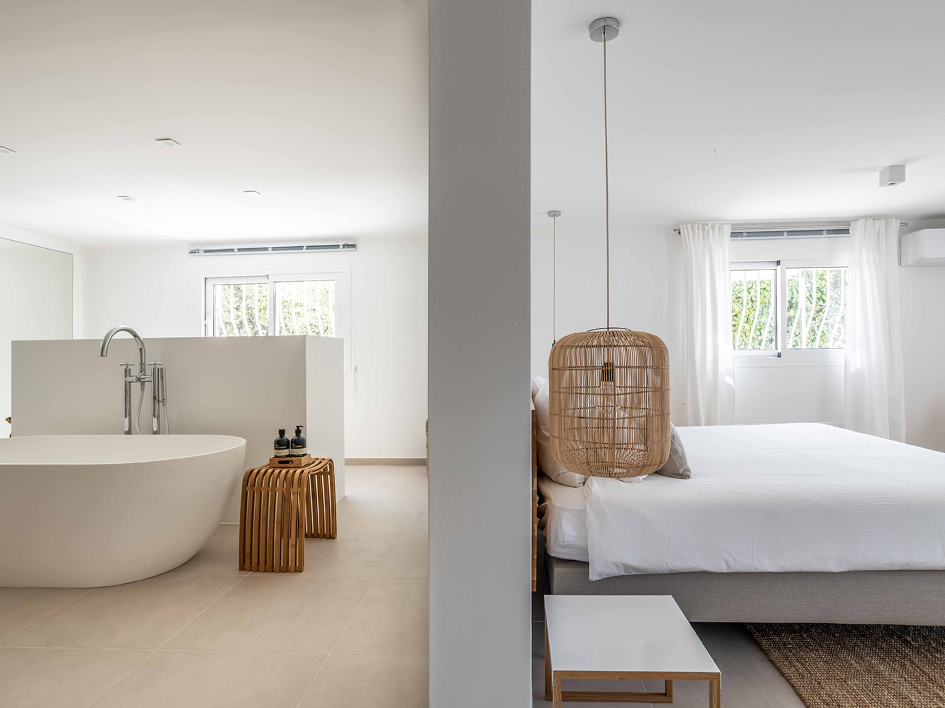 Slaapkamer 1, is een bijzonder ruime kamer van 50 m², gelegen op de begane grond (niveau living). De kamer is ingericht met een tweepersoons boxspring (180x200) en een luxe designbadkamer met regendouche, vrijstaand ligbad en separaat toilet. Via openslaande deuren heeft u directe toegang tot het terras, waar u onder de buitendouche kunt genieten of direct een verfrissende duik in het zwembad kunt nemen.