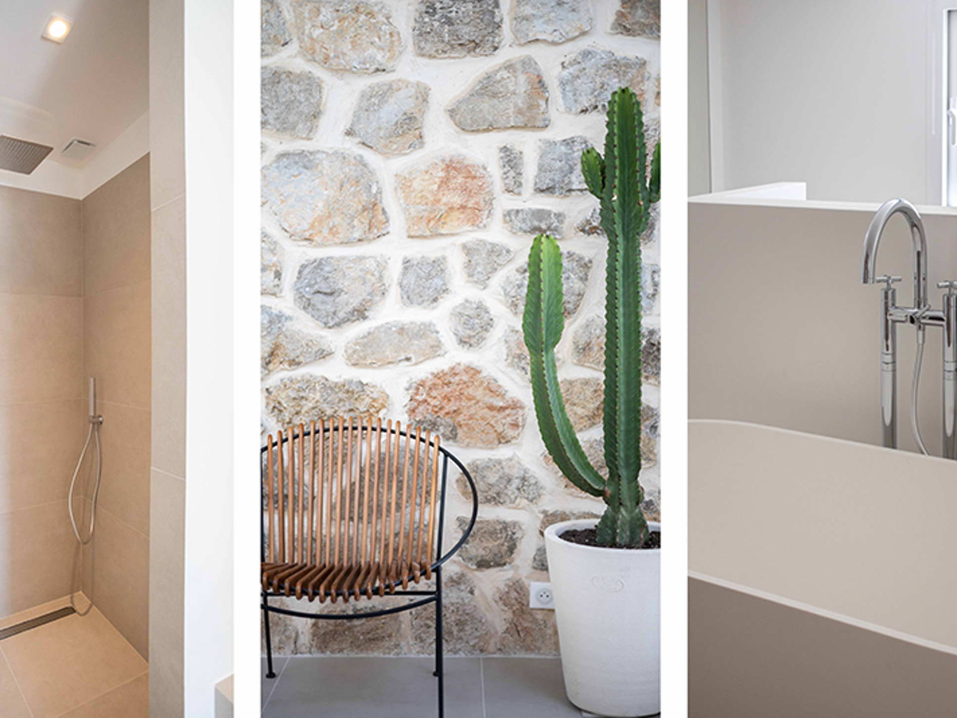 Slaapkamer 2, bevindt zich op de eerste verdieping en is voorzien van een tweepersoons boxspring (180x200). De badkamer en-suite beschikt over een regendouche, design wastafels en een separaat toilet. Vanuit deze kamer heeft u toegang tot een privé balkon met uitzicht op het zwembad en de groene heuvels in de verte.