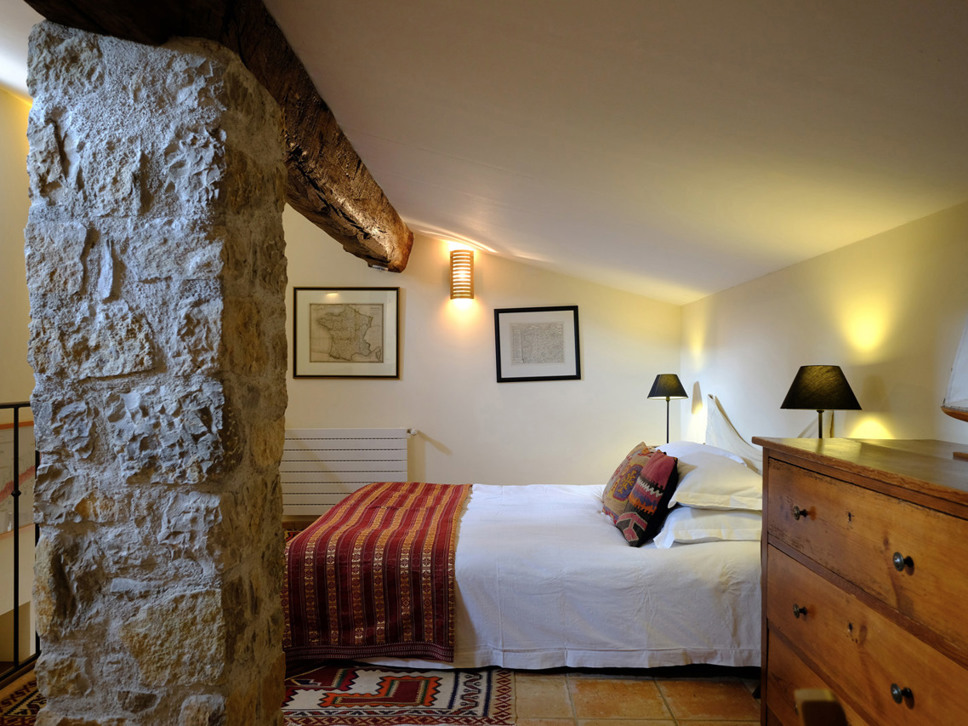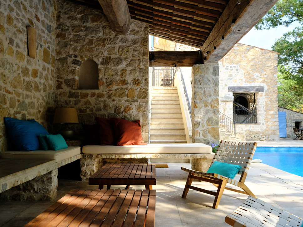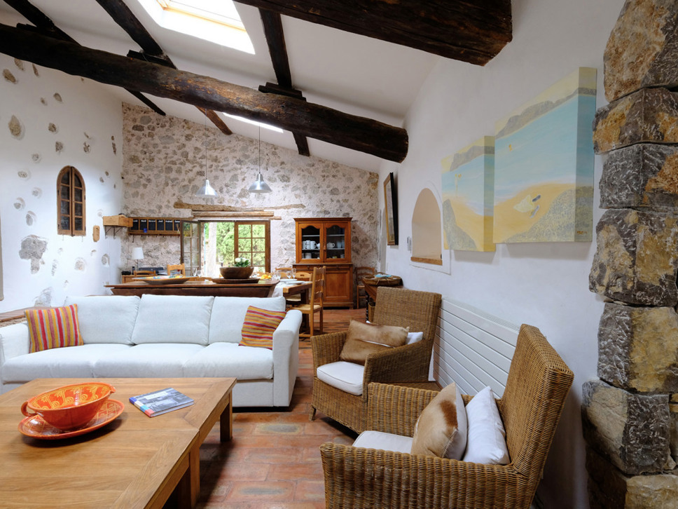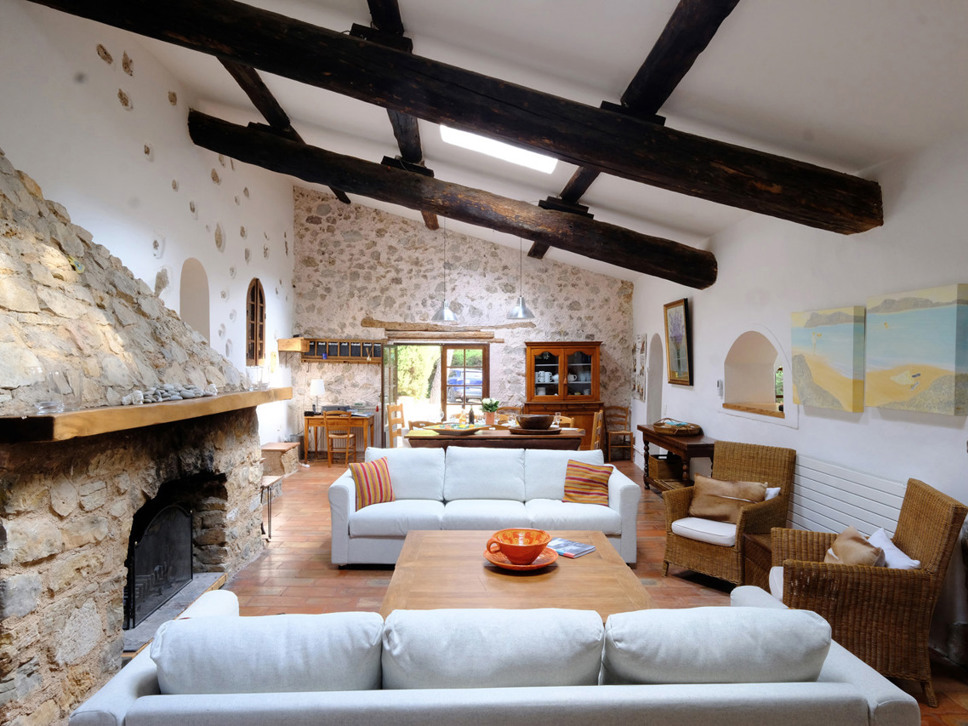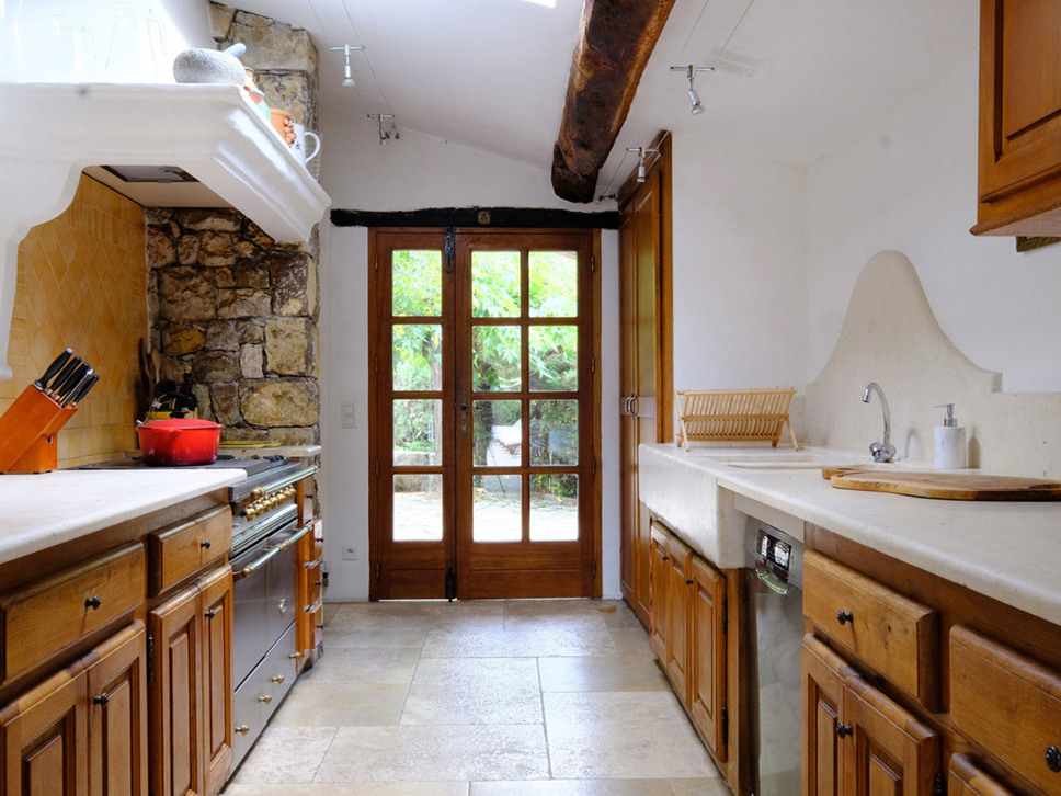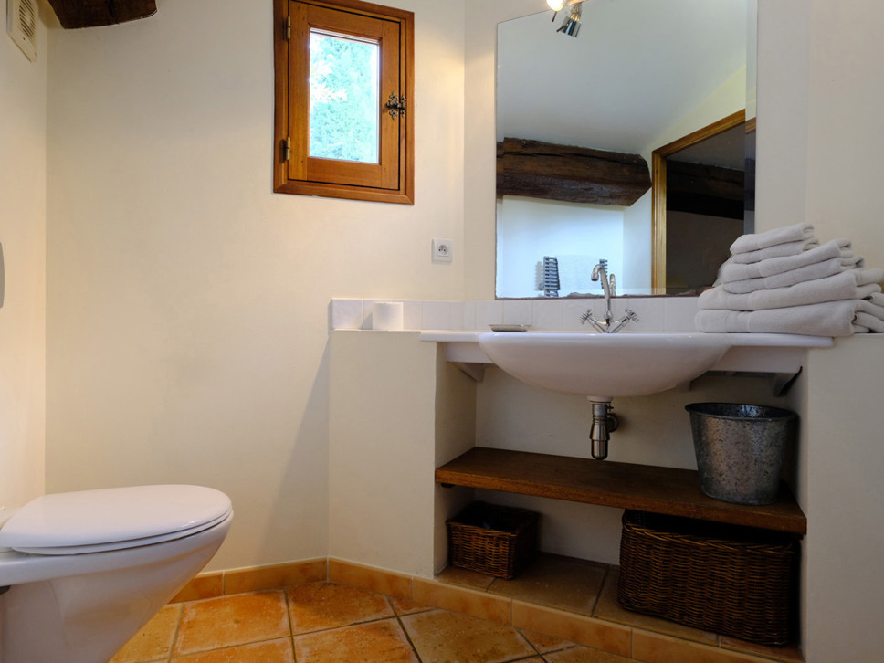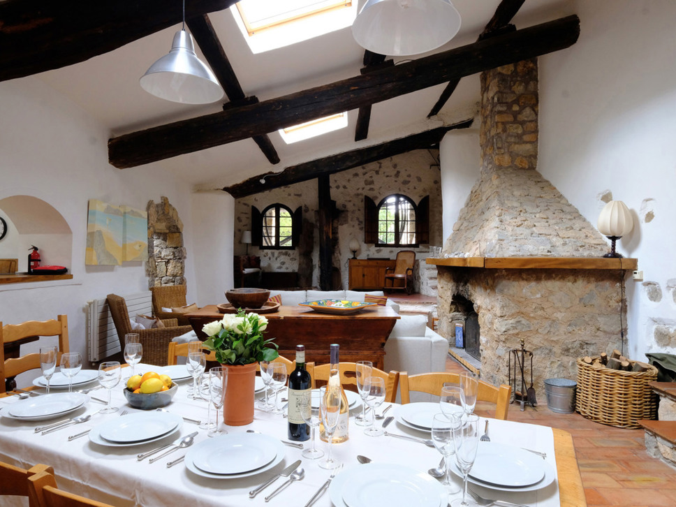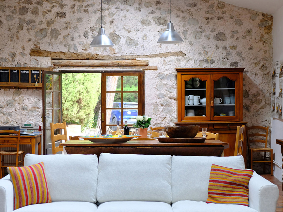 In de woonkamer bevindt zich een comfortabele zithoek met een grote open haard. In het verlengde van de zithoek staat een eikenhouten eettafel. Waarschijnlijk eet u vooral buiten op het terras in het verlengde van de keuken. Authentieke elementen zoals de molensteen en het grote houten waterrad herinneren aan de geschiedenis van deze villa. Heel mooi om te zien hoe de eigenaren deze woning hebben omgetoverd tot een comfortable vakantievilla in het hart van de Provence.