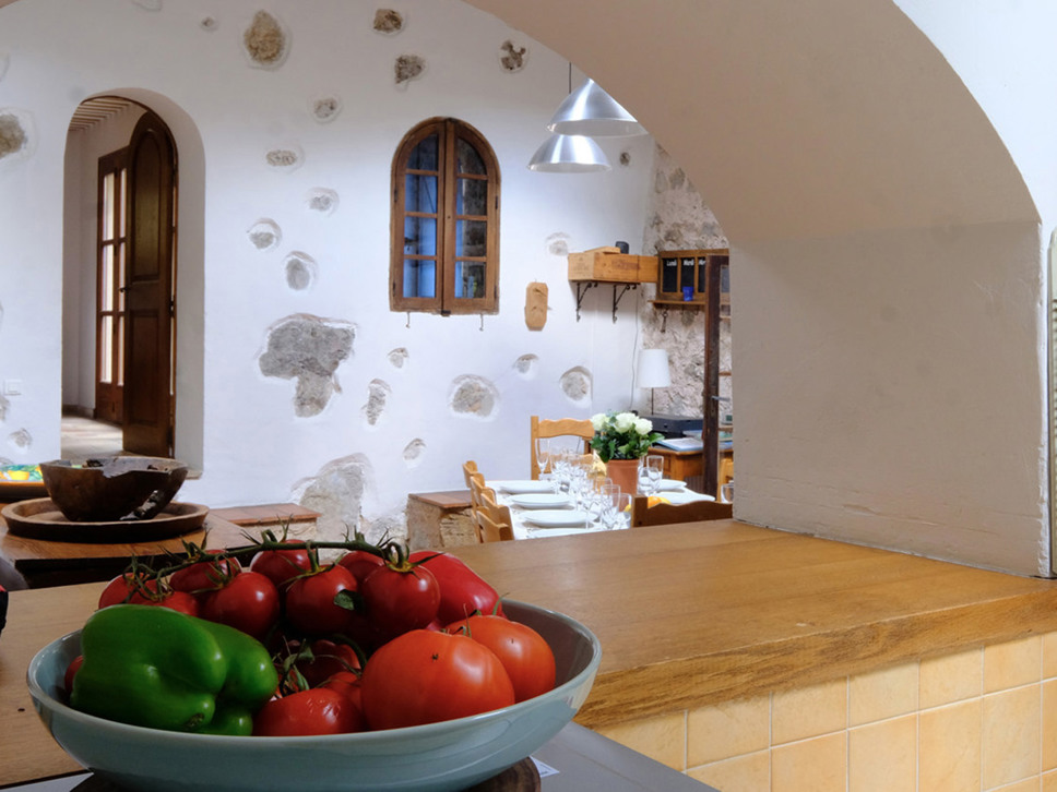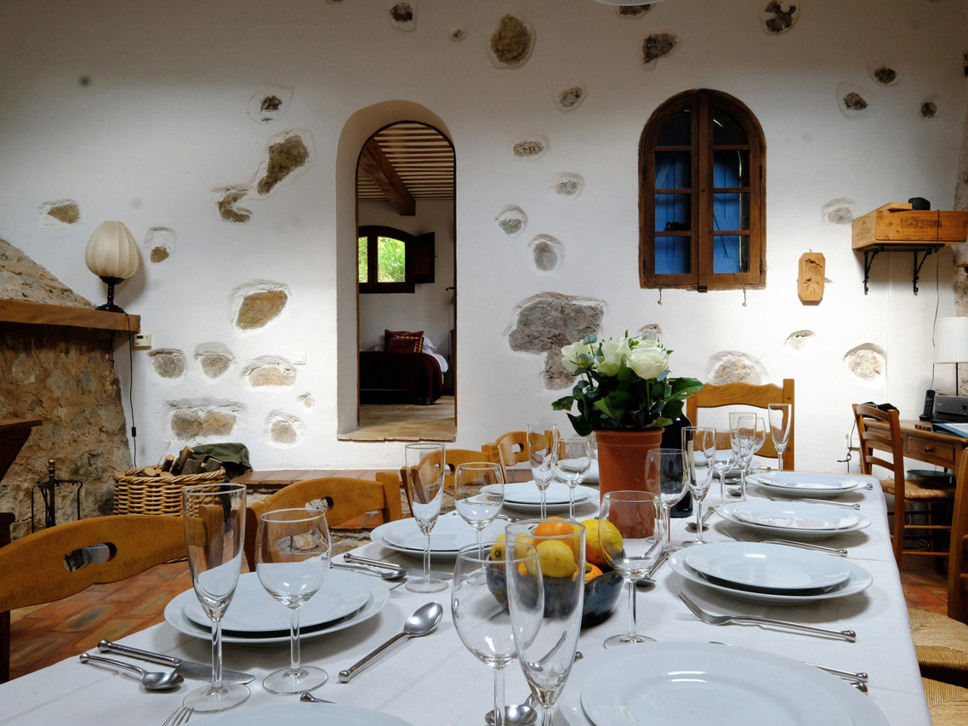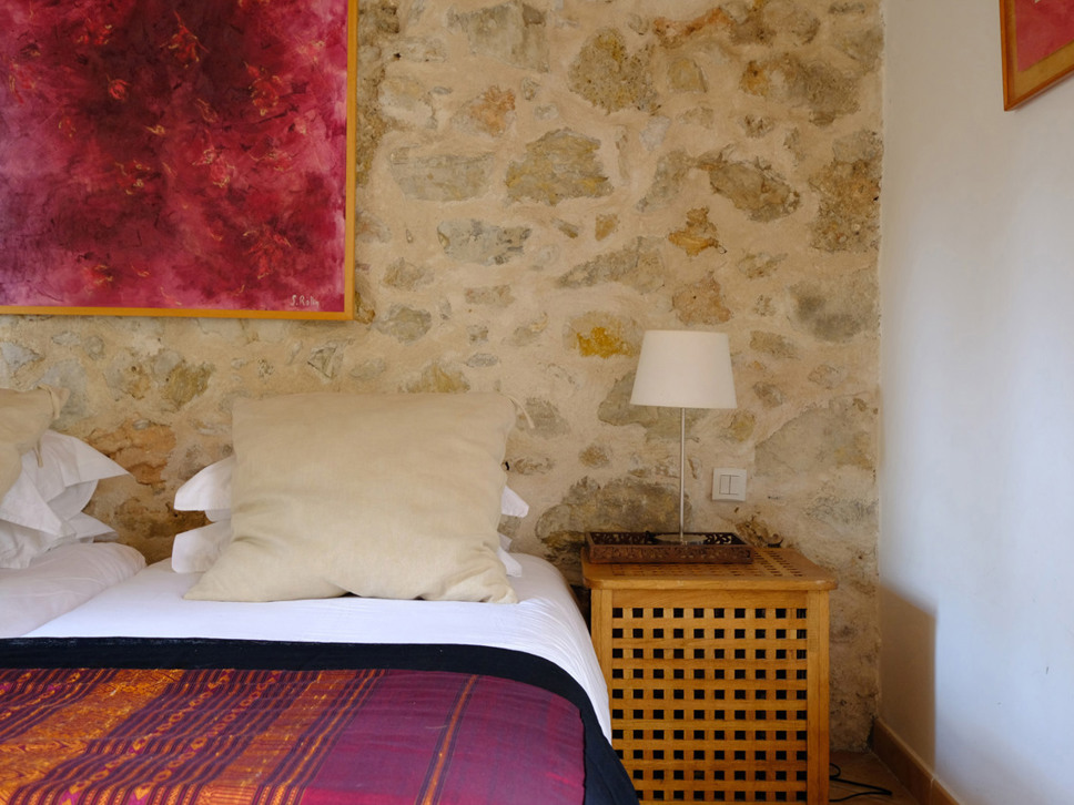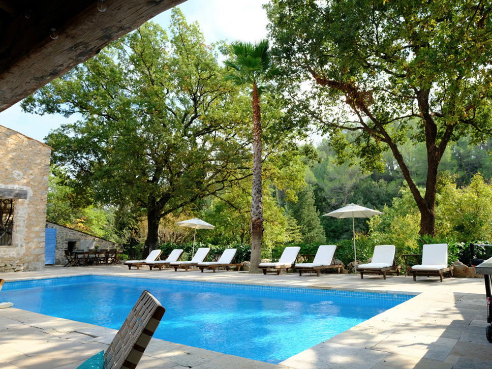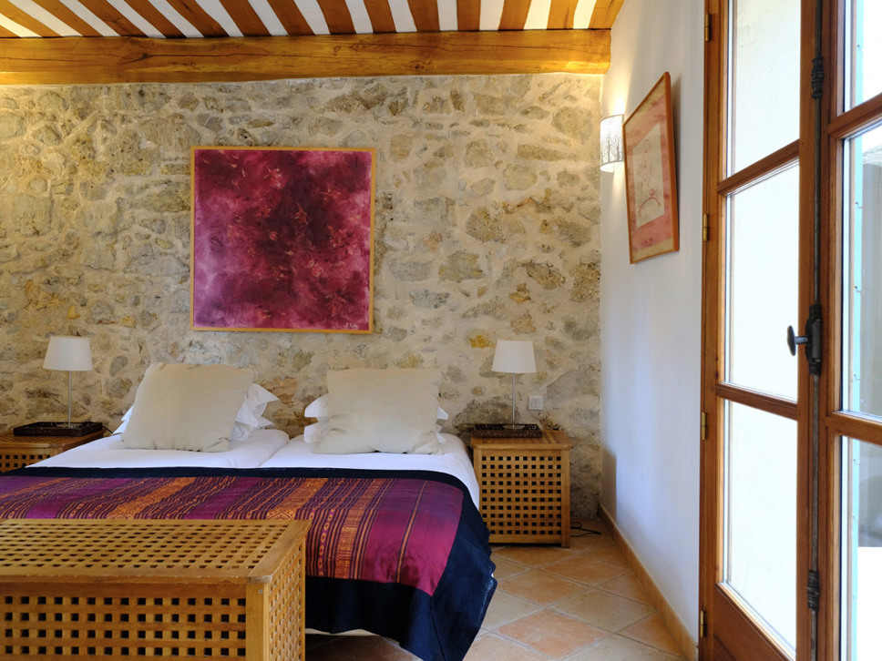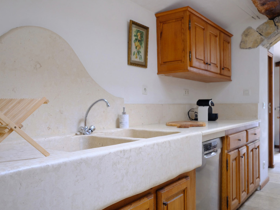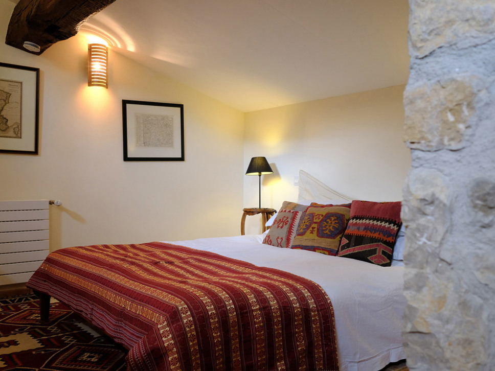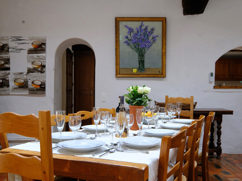 In de woonkamer bevindt zich een comfortabele zithoek met een grote open haard. In het verlengde van de zithoek staat een eikenhouten eettafel. Waarschijnlijk eet u vooral buiten op het terras in het verlengde van de keuken. Authentieke elementen zoals de molensteen en het grote houten waterrad herinneren aan de geschiedenis van deze villa. Heel mooi om te zien hoe de eigenaren deze woning hebben omgetoverd tot een comfortable vakantievilla in het hart van de Provence.
