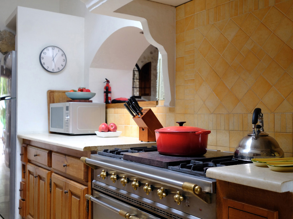 De keuken is royaal en goed voorzien van diverse apparatuur waaronder een fraai 6-pits fornuis, twee ovens, een Amerikaanse koelkast, vaatwasser en magnetron. Vanuit de keuken heeft u via openslaande deuren toegang tot de schaduwrijke patio.