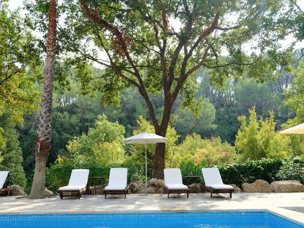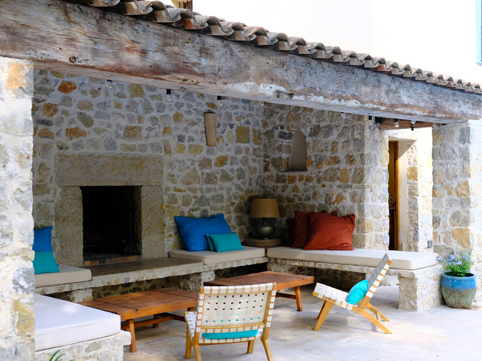 Centraal in de tuin ligt het grote zwembad van 12 x 6 meter, omringd door een zonneterras met comfortabele teakhouten ligbedden, stoelen en twee ruime eettafels waar tot twaalf personen kunnen aanschuiven voor een gezamenlijk diner of ontspannen ontbijt. Bijzonder fraai vinden we het poolhouse: een sfeervol, overdekt terras met open haard en royale loungebanken, ideaal voor lange zomeravonden.