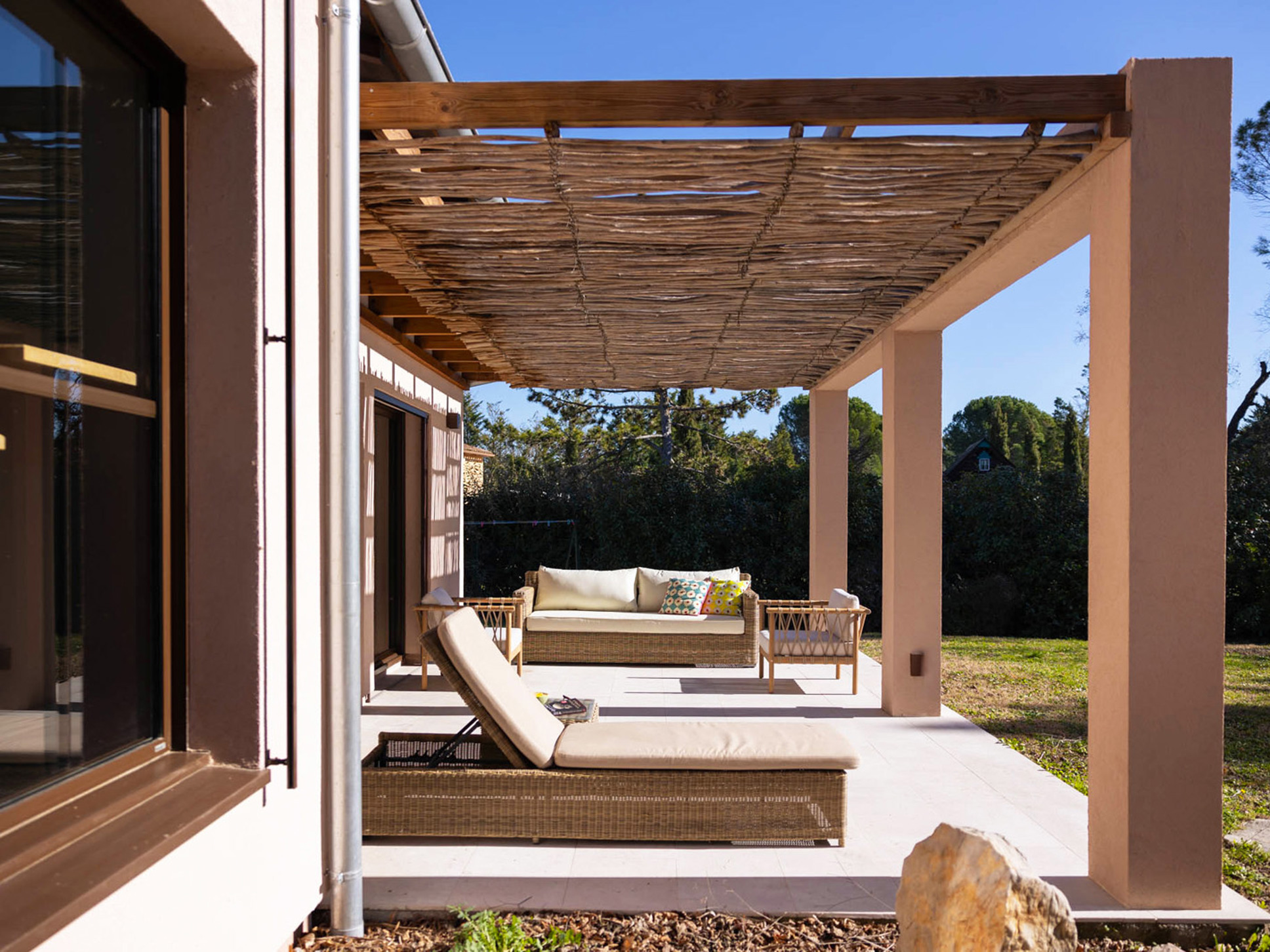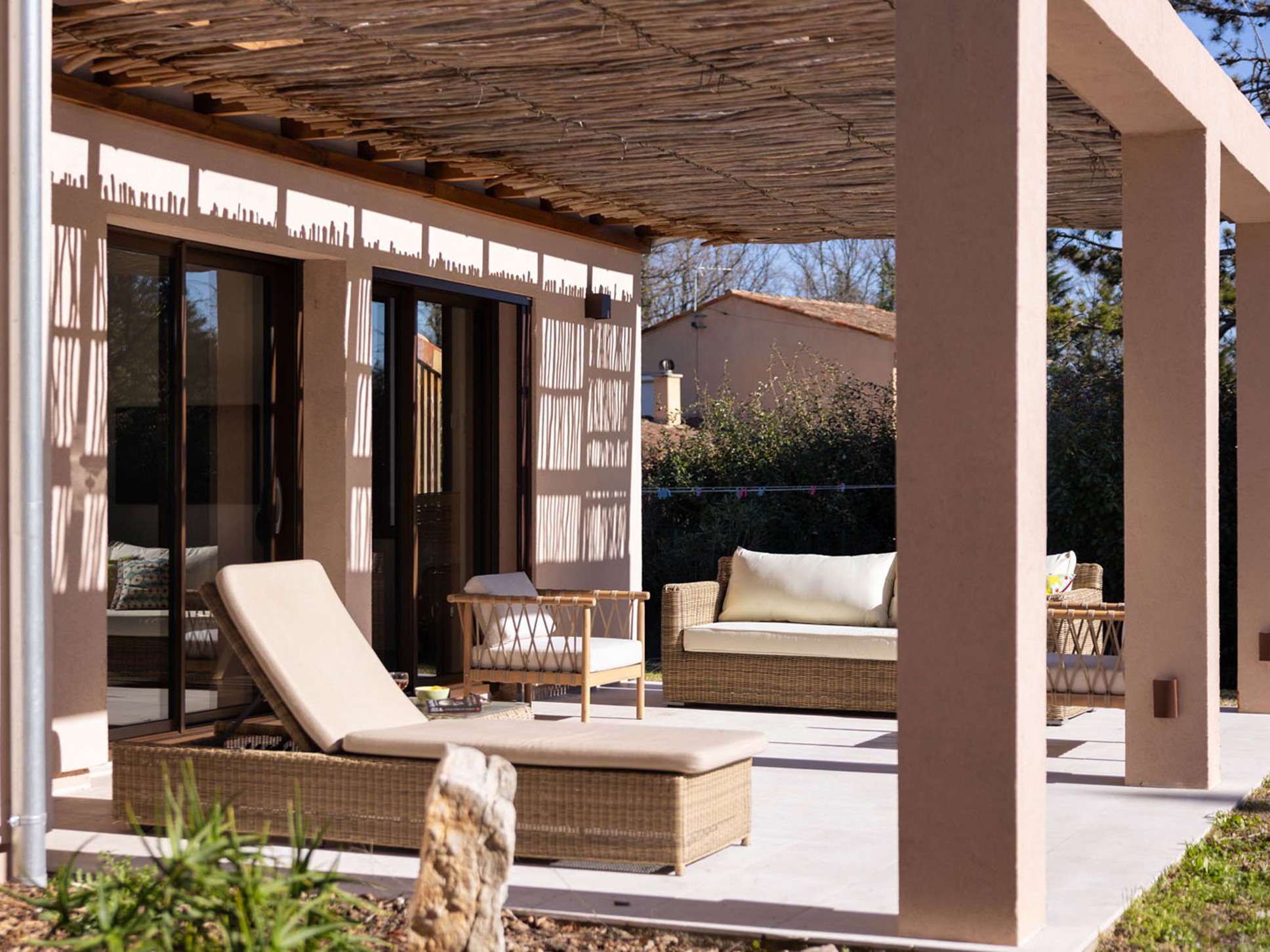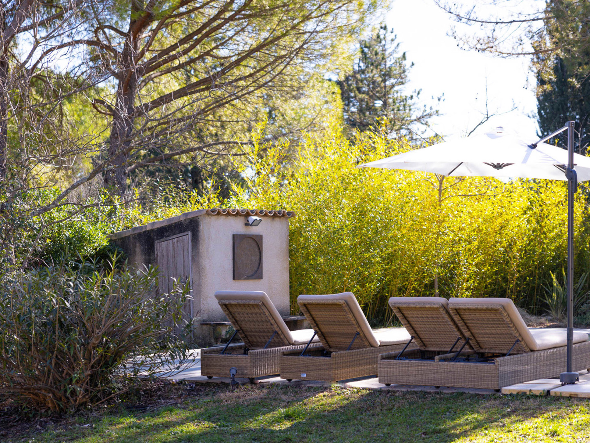 Het perceel is ruim (4700 m2) en geheel vlak. Vanuit de living bieden grote schuifdeuren toegang tot de tuin aan de zwembadzijde. Het terras is gedeeltelijk overdekt. Hier staan enkele sunloungers en een luxe loungeset. Op het terras te bereiken van uit het eetgedeelte staat een eettafel met 8 zitplaatsen.