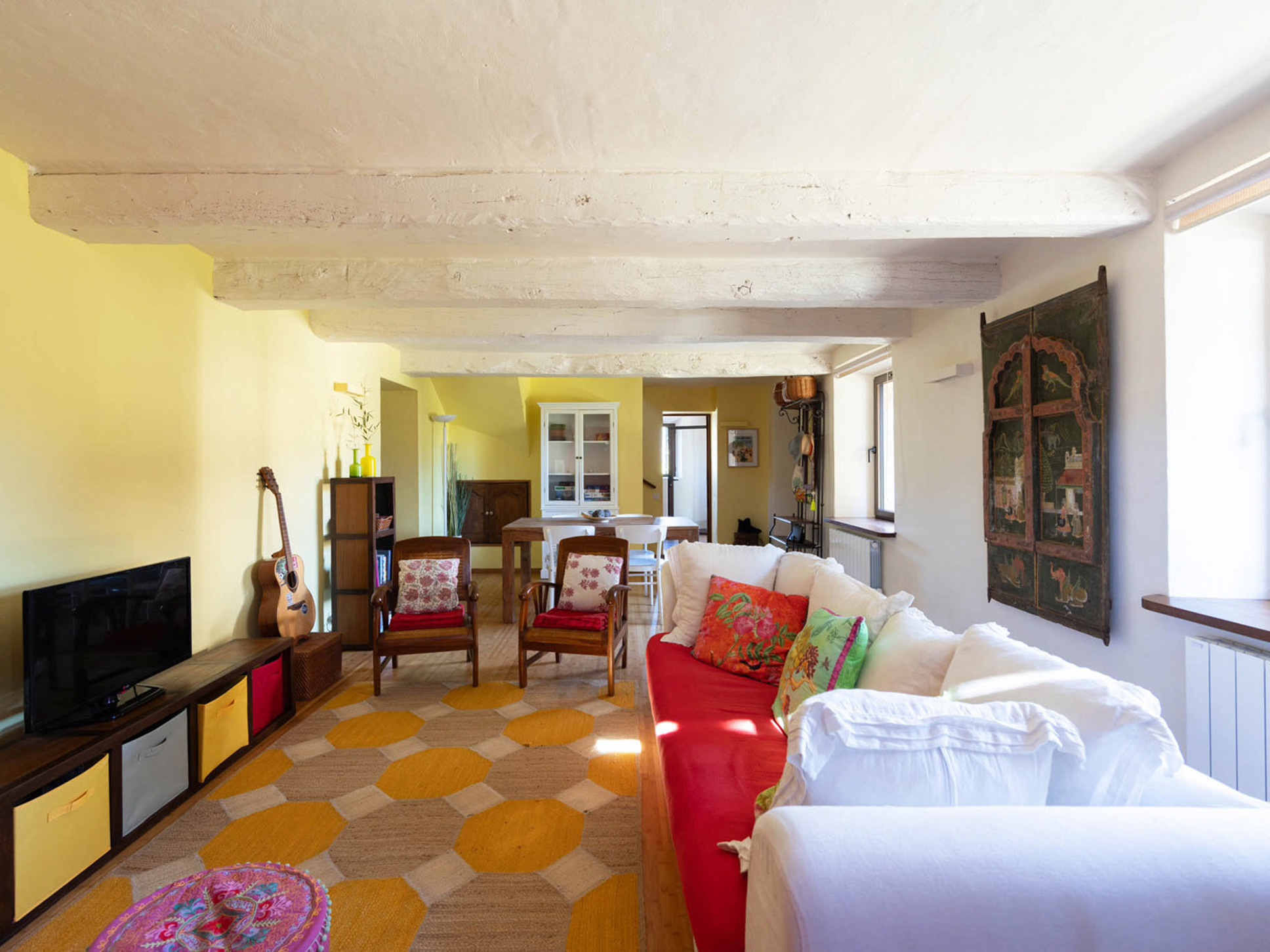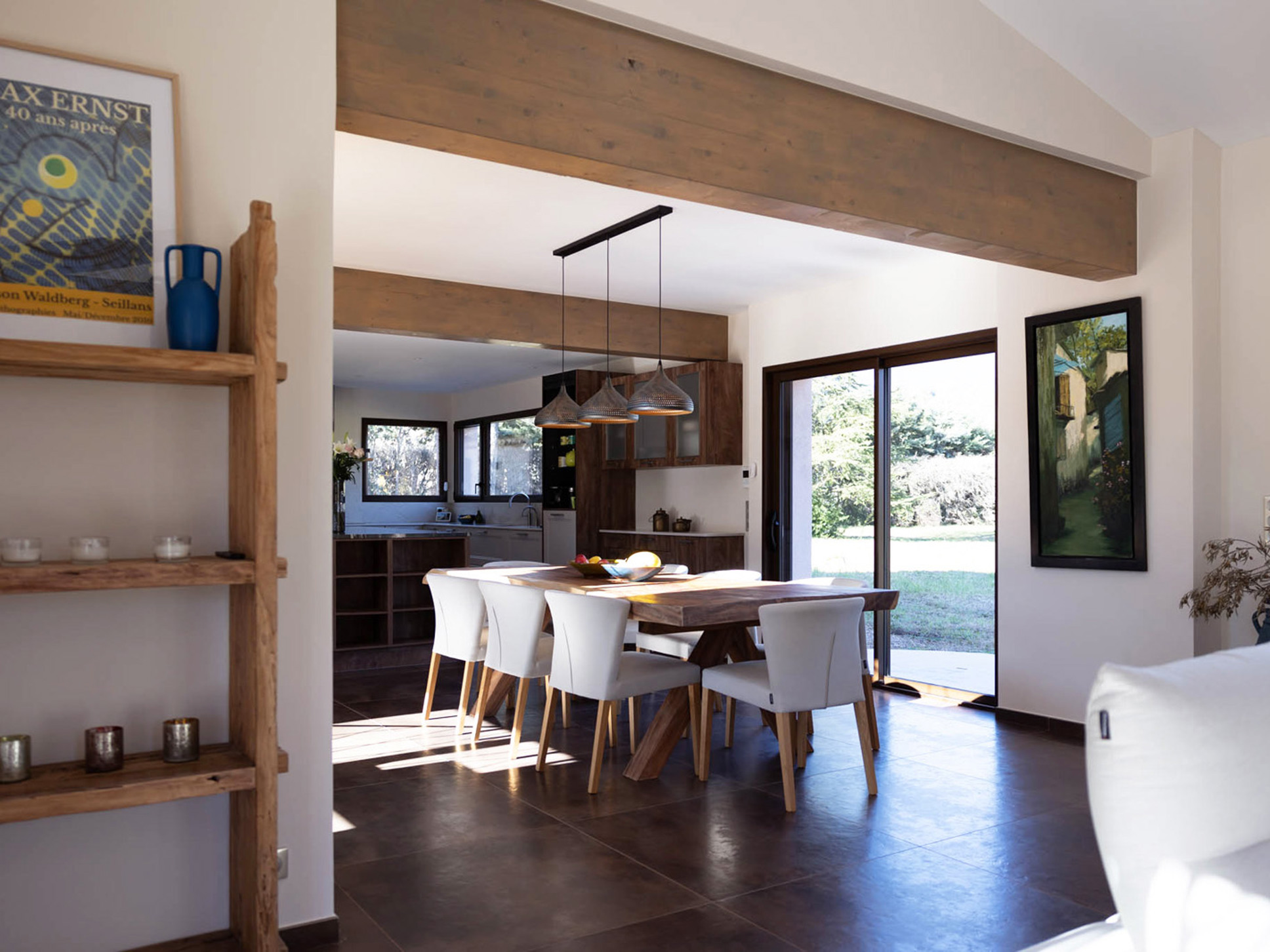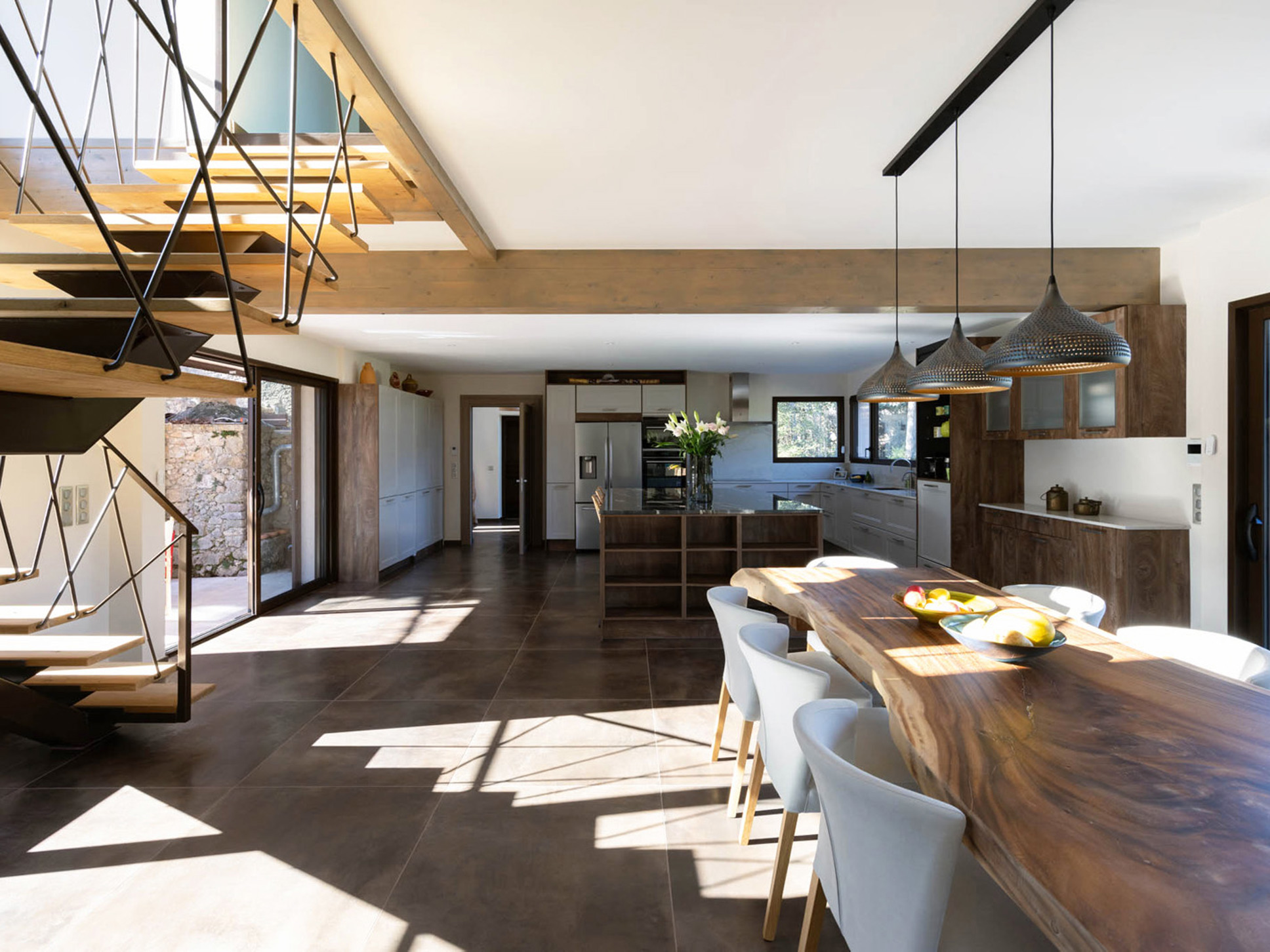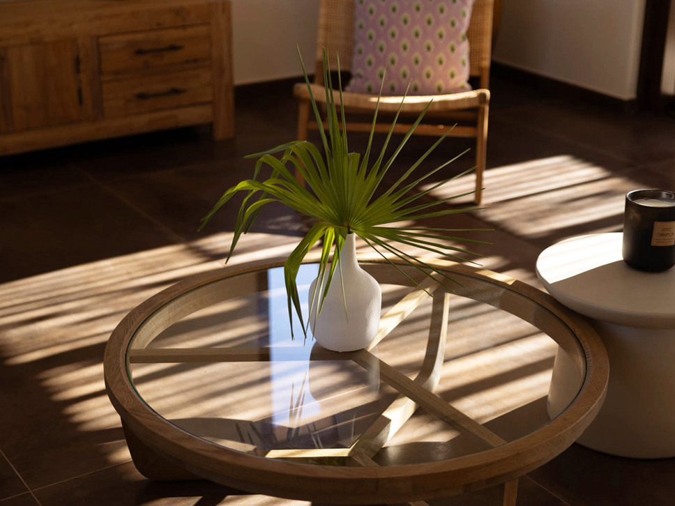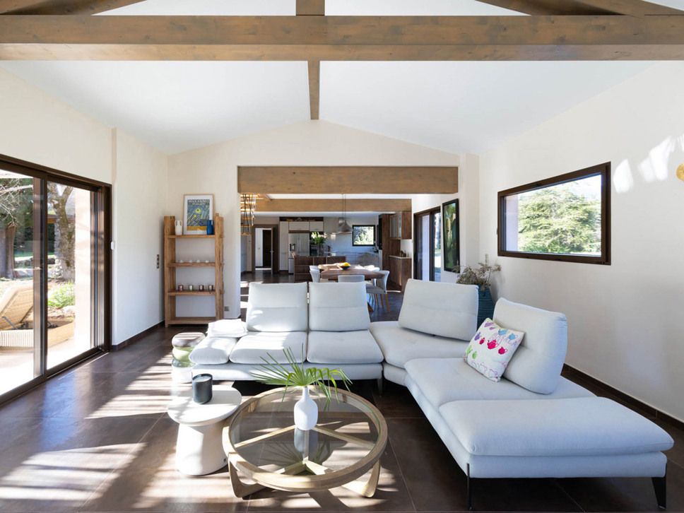 In het nieuwe, moderne deel van de villa bevindt zich de royale living met open keuken en de ouder slaapkamer, zeg maar suite.